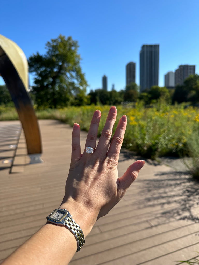 “The process could not have been easier for John! We both live in Chicago and John was able to complete the entire process over the phone. Ordering a ring without seeing the diamond in person could be worrisome to others, but we knew that with Manfredi's we would be getting the best possible ring while also staying within our budget. We loved that the team really advised John on every aspect - they let him customize the design while also giving suggestions on what would work best and how he could best maximize his budget. Cassidy's first reaction when seeing the ring was true disbelief that something so beautiful was hers!!” - Cassidy