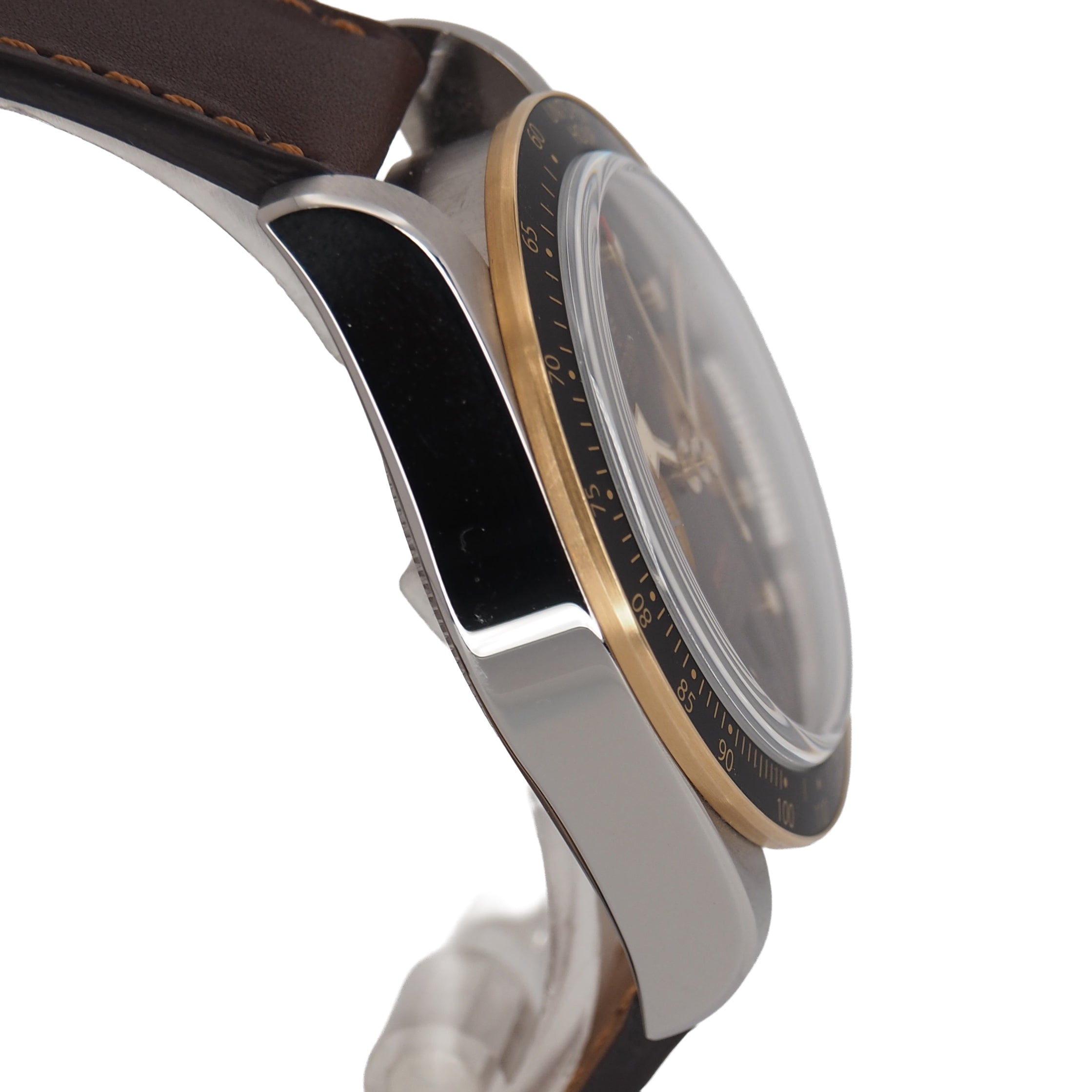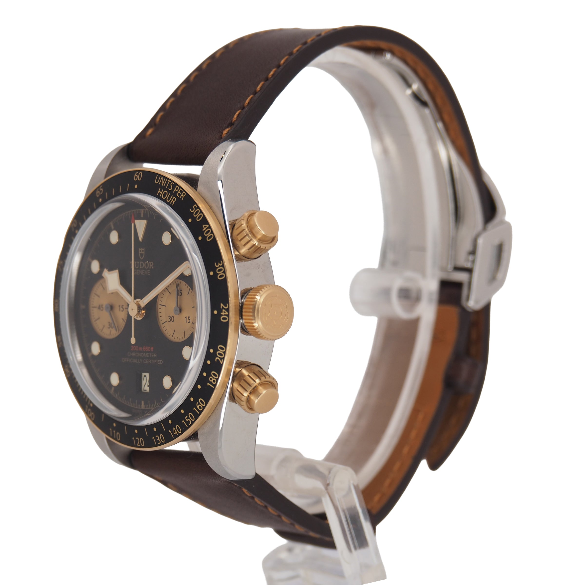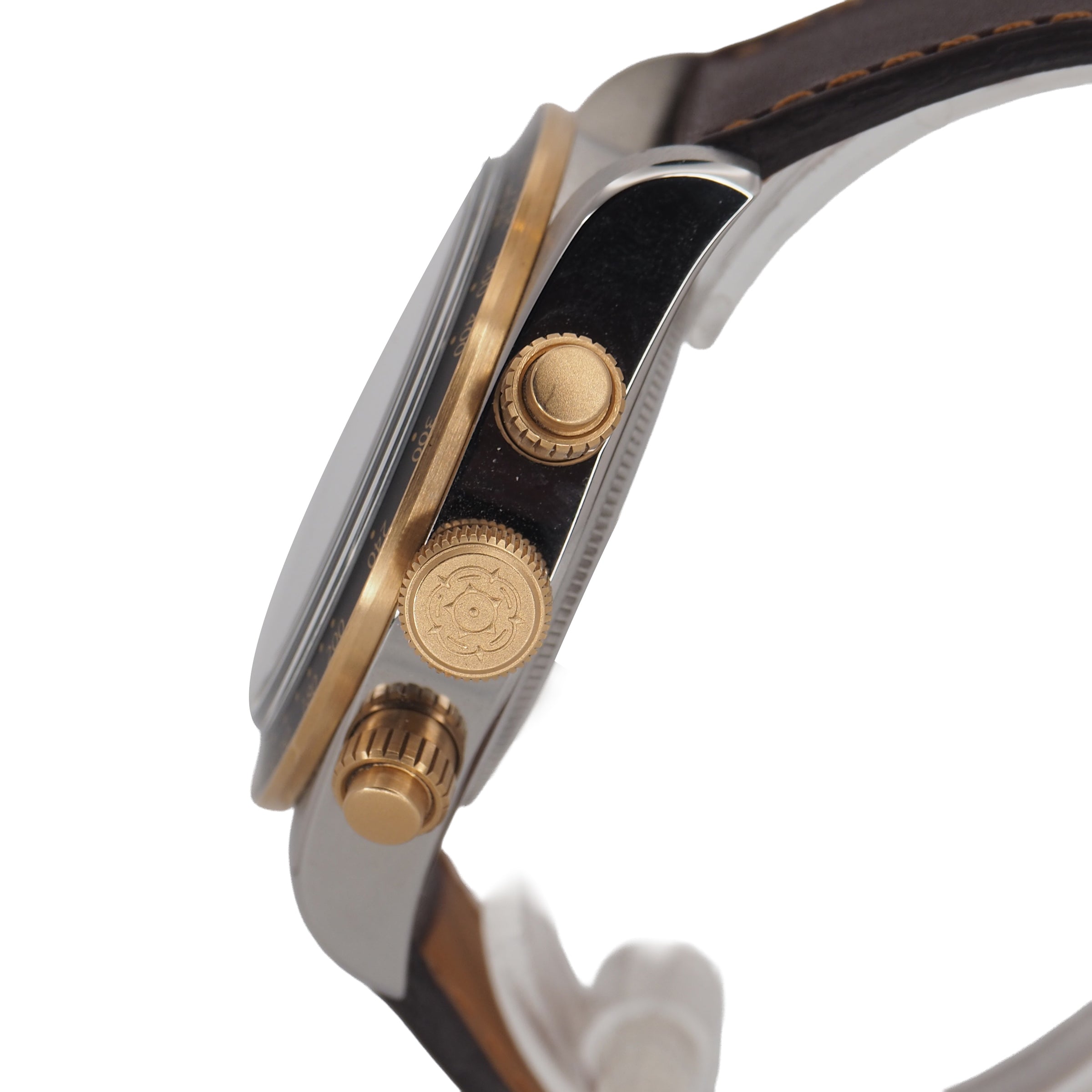 The Tudor Black Bay Chrono S&G ref. M79363N-0002 brings together the boldness of a racing chronograph with the rugged heritage of a diver’s timepiece. Housed in a 41 mm stainless steel case with polished and satin-finish surfaces, the watch features a fixed solid yellow gold bezel with a matte black anodized aluminum insert and a gold-engraved tachymetric scale — a design cue that channels Tudor’s sporting lineage. The domed black dial, framed by a domed sapphire crystal, is detailed with sub-dials at 3 and 9 o’clock, luminous indices, and “snowflake” hands, delivering excellent legibility and timeless appeal.