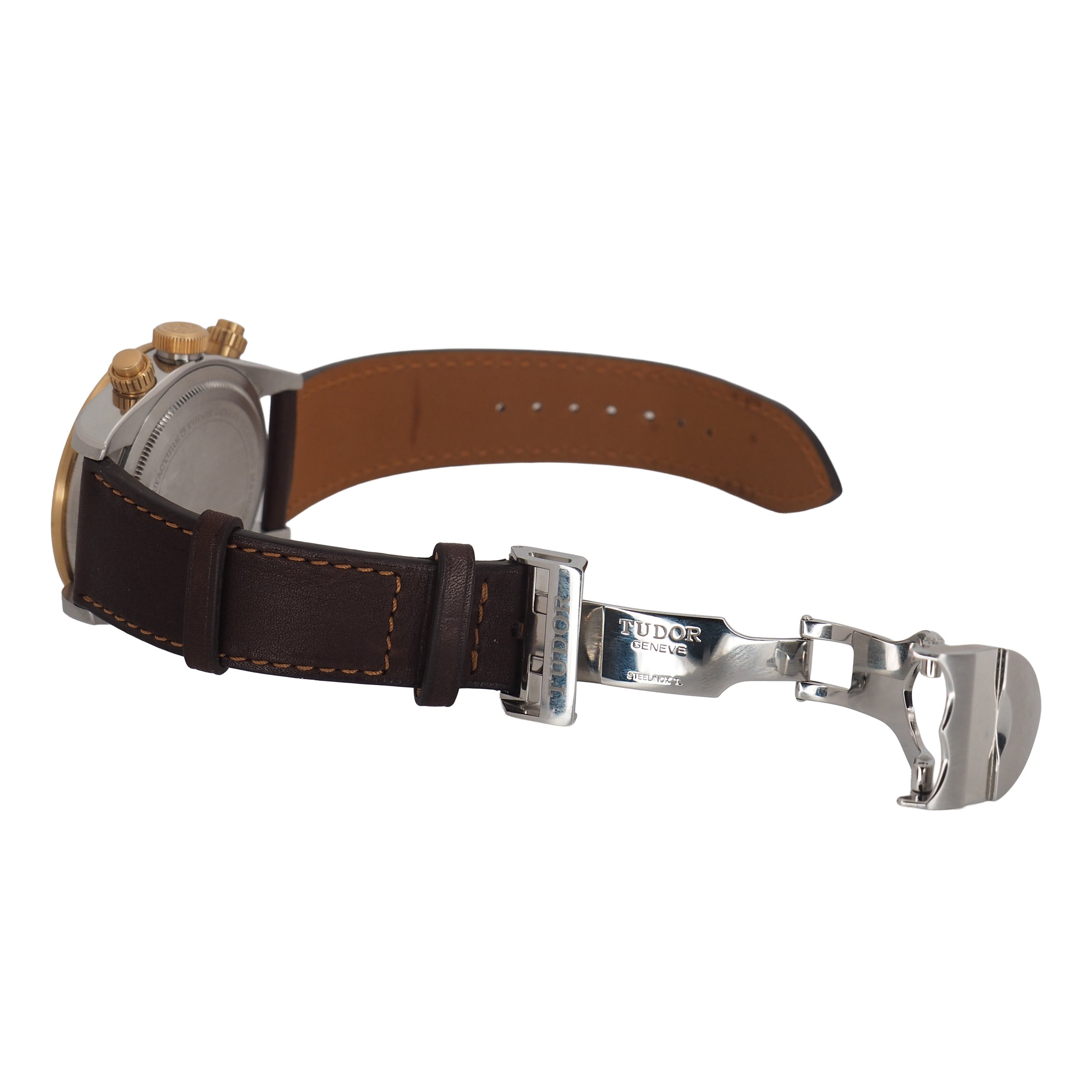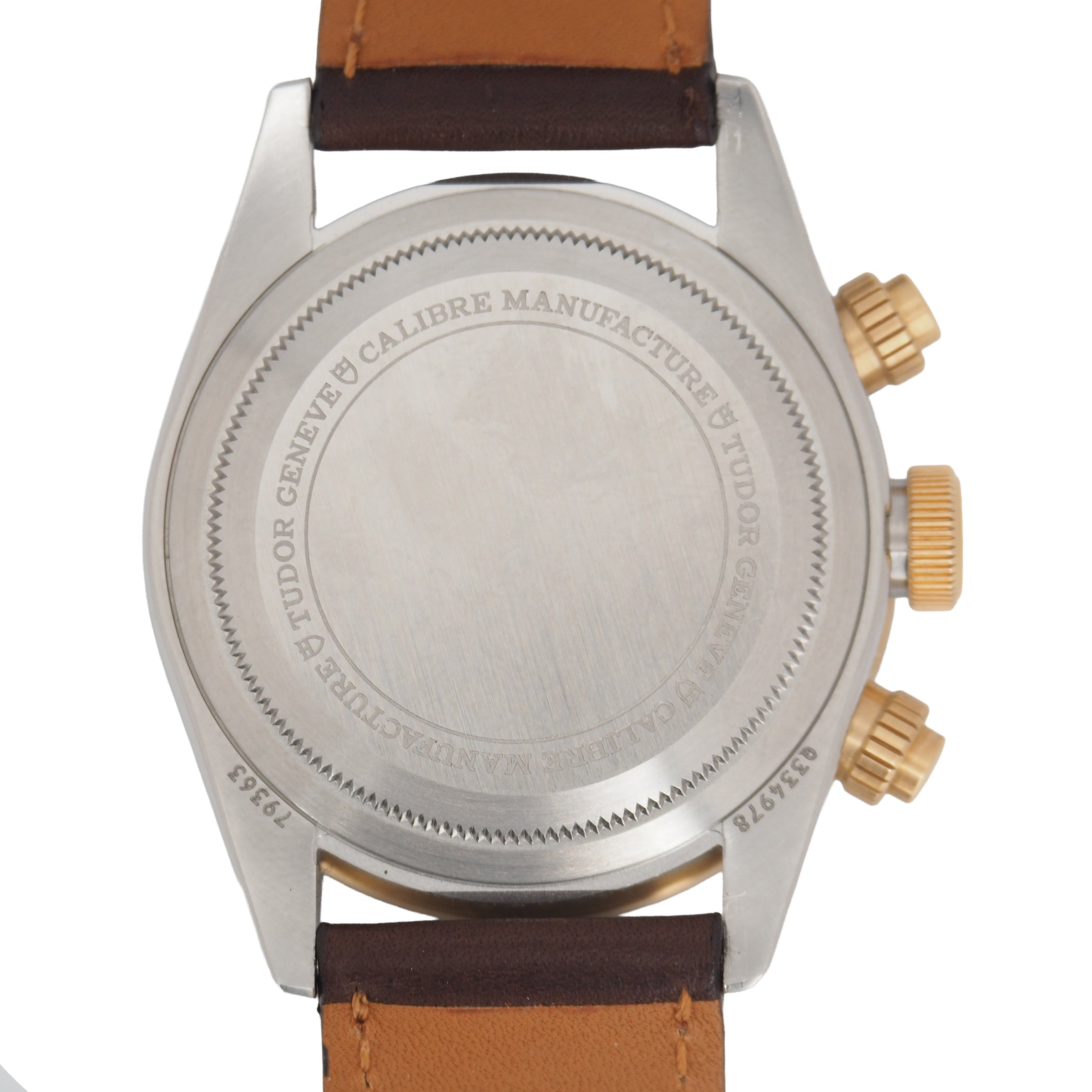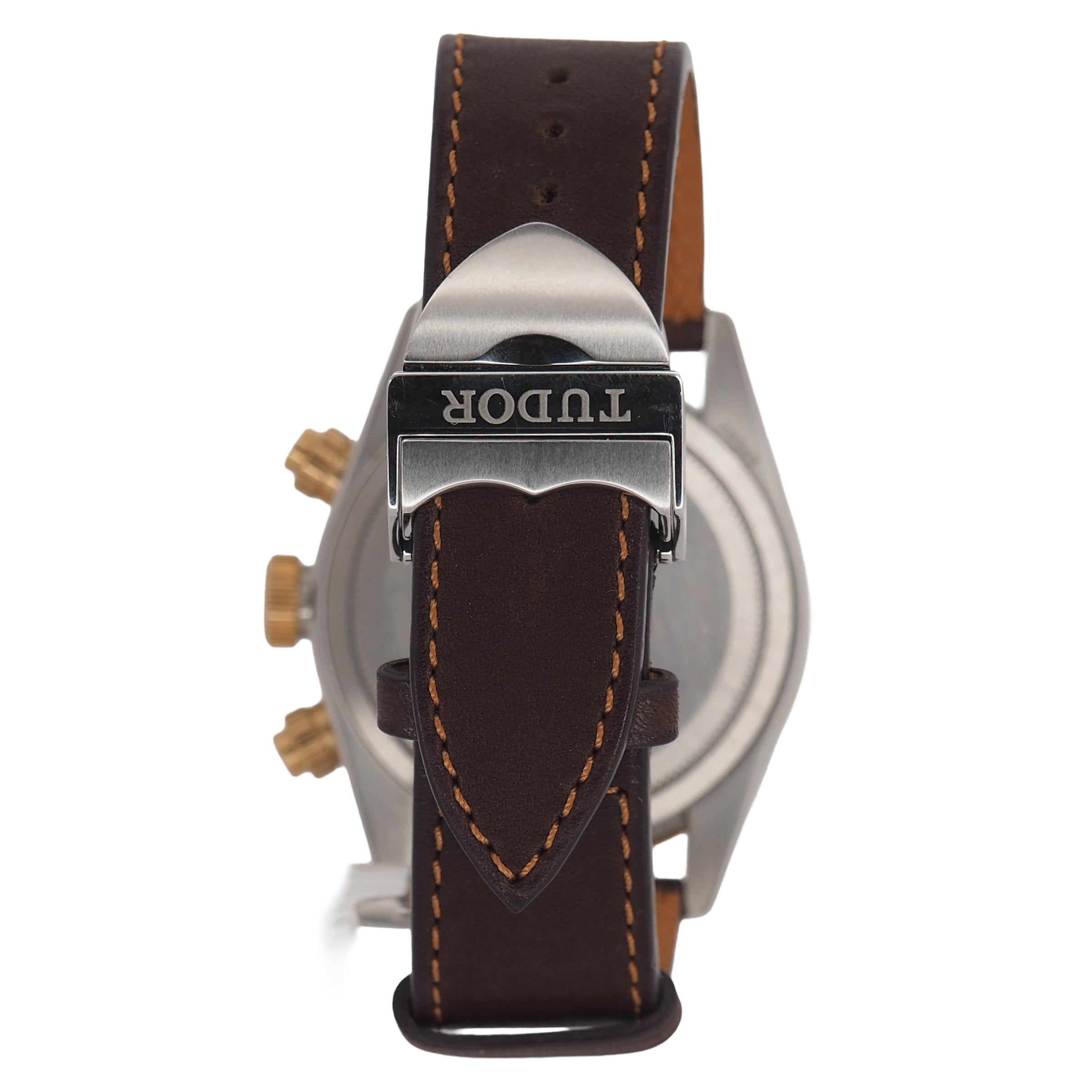 Under the sapphire lies Tudor’s in-house, COSC-certified Calibre MT5813, a self-winding chronograph movement equipped with a column wheel, vertical clutch, and an approximately 70-hour power reserve. With screw-down gold pushers at 2 and 4 o’clock, plus a screw-down crown embossed with the Tudor rose, this watch maintains water-resistance to 200 meters (660 ft), making it as capable in everyday wear as it is striking on the wrist.