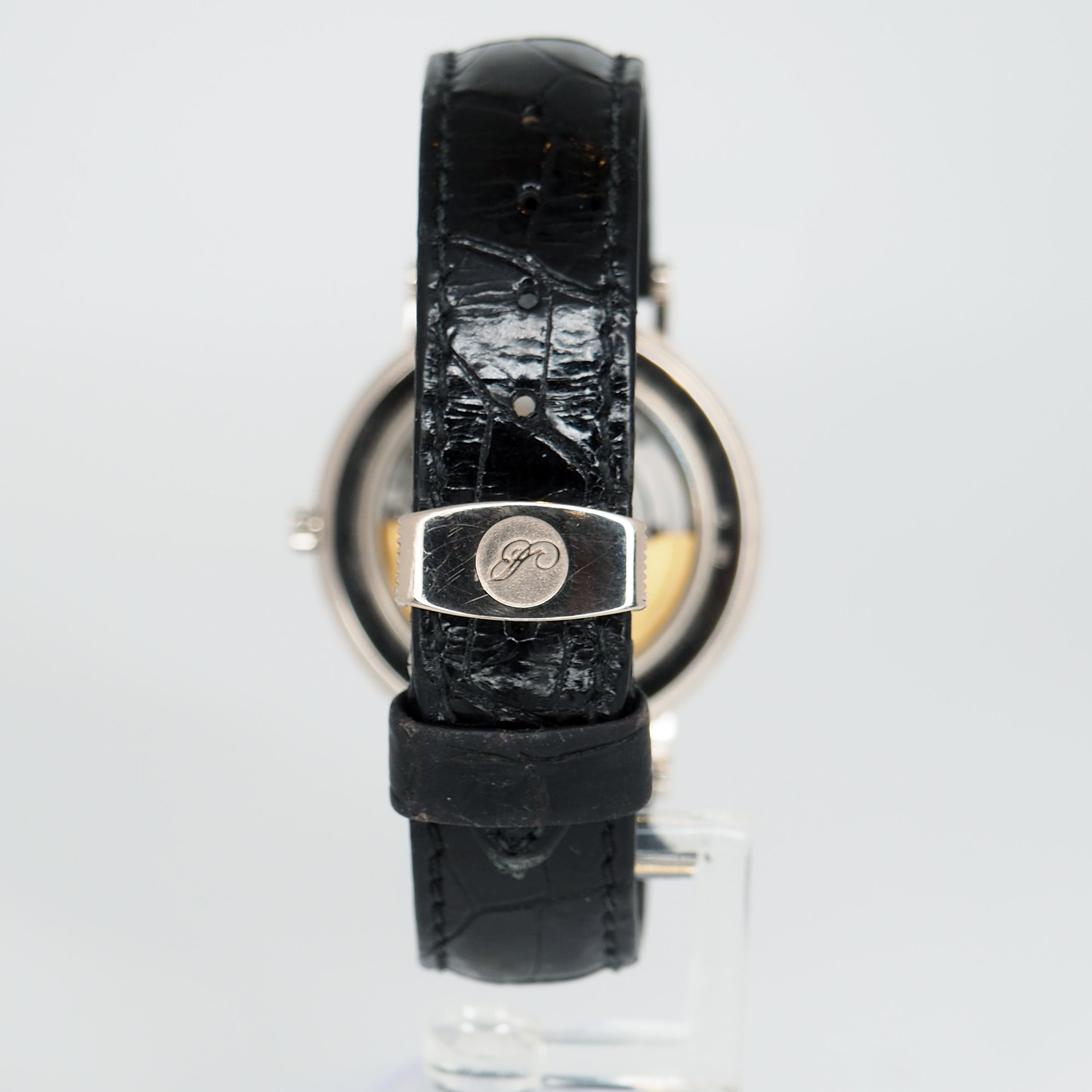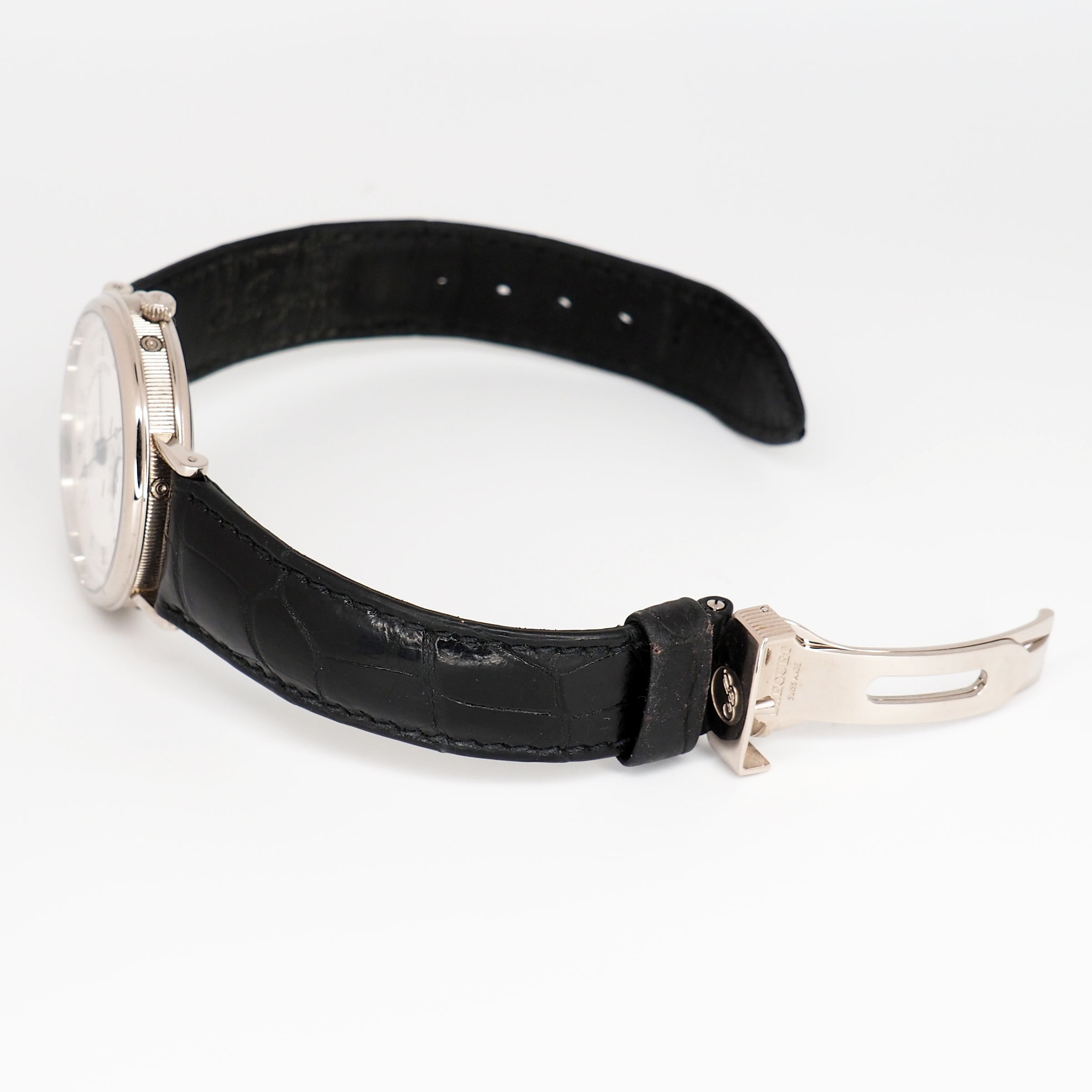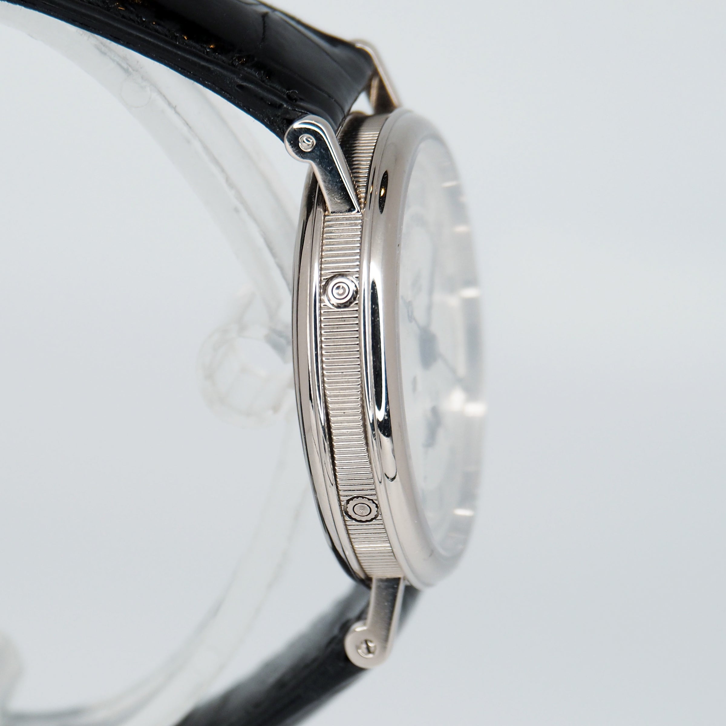 Elevating horological elegance to its finest, the Breguet Classique Complications Perpetual Calendar in 18 k white gold is a masterpiece where tradition meets technical mastery. Encased in a modest yet noble 36 mm case, this timepiece exudes understated prestige — a subtle reminder that refinement need not shout. The opaline silver dial—embellished with classic Roman numerals and a delicate guilloché pattern—serves as the backdrop for a full perpetual calendar display, complete with day, date, month, leap‑year indicator, and an elegant moon‑phase subdial.