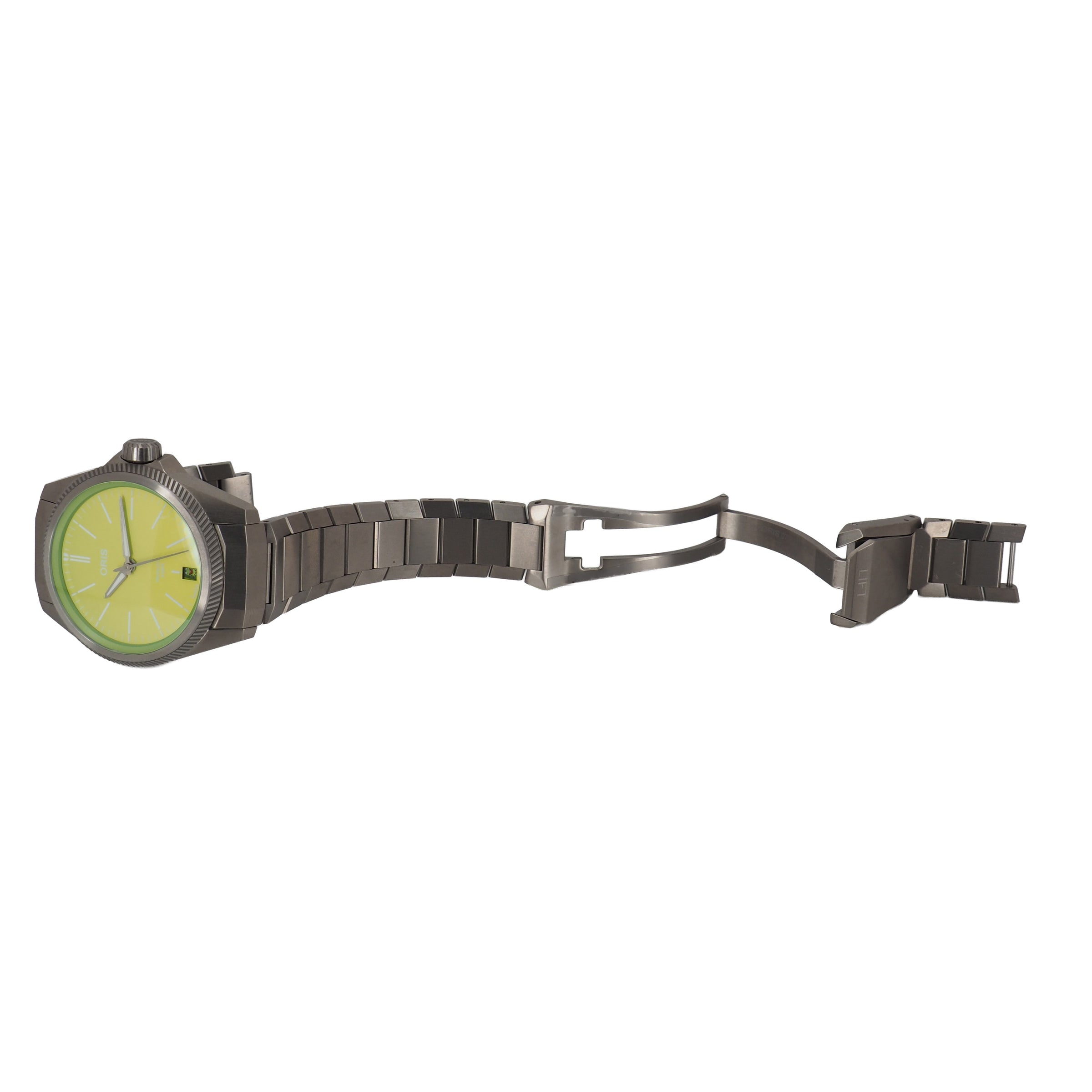 The Oris ProPilot X Calibre 400 is a modern, lightweight luxury sports watch designed for everyday wear. Crafted from titanium, the 39 mm case and integrated bracelet offer exceptional comfort while maintaining a strong, contemporary look. The clean, matte dial with bold luminous markers ensures excellent legibility, and the watch is protected by a sapphire crystal with an exhibition caseback.