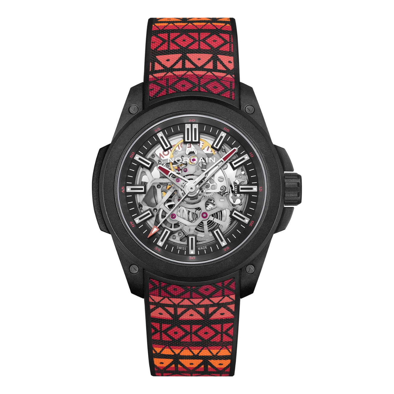 Crafted in NORQAIN’s proprietary NORTEQ material, this 42mm limited edition celebrates the brand’s partnership with wildlife ambassador Dean Schneider and his Hakuna Mipaka sanctuary. The lightweight yet ultra-durable case houses a COSC-certified skeleton automatic movement visible through both sides, delivering 41 hours of power reserve. Red accents highlight the openworked dial, while rhodium-plated hands glow with Super-LumiNova. The black safari-pattern rubber strap is individually hand-applied, making each watch unique. A portion of sales supports wildlife conservation, underscoring its purpose beyond performance. Finished with a sandblasted titanium core and 200m water resistance, this timepiece embodies rugged sophistication, artisanal craft, and a powerful commitment to protecting nature. Limited to 200 pieces worldwide