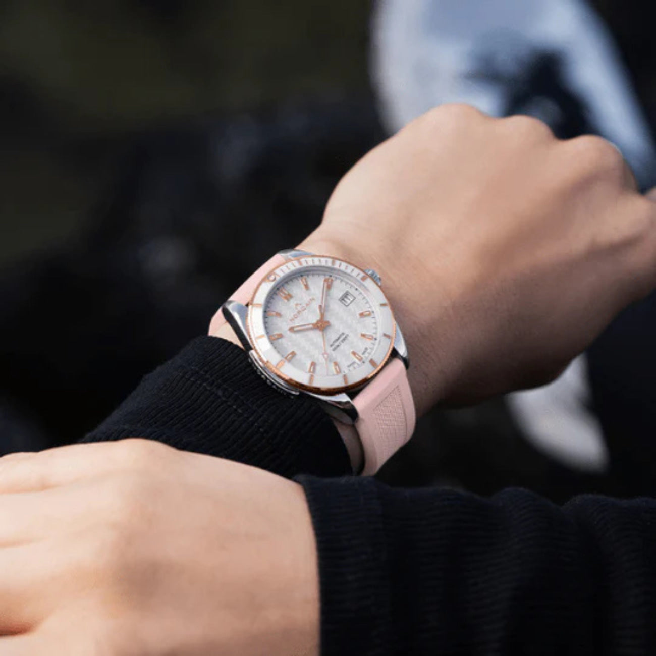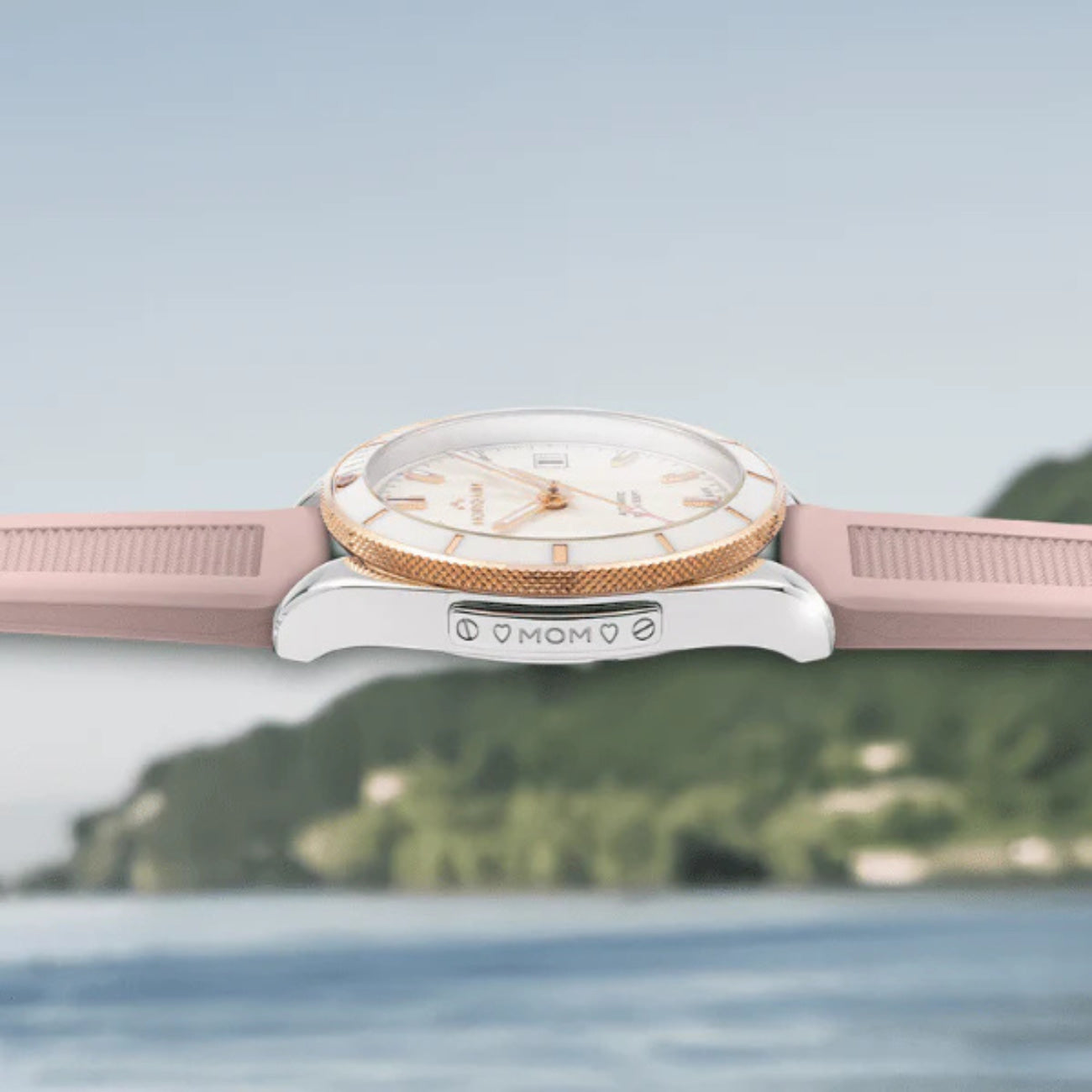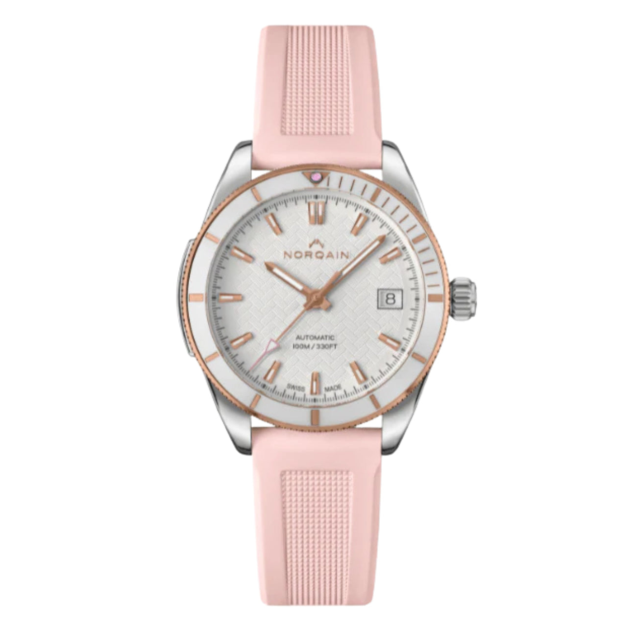 For the bold and the fearless, the Adventure Sport 37mm in pink is built to go wherever you do—whether it’s summit to sea or city to trail. The signature NORQAIN pattern on the dial draws inspiration from the peaks of the Swiss Alps, a nod to where the adventure begins.