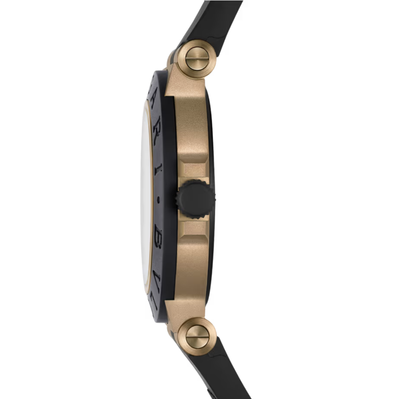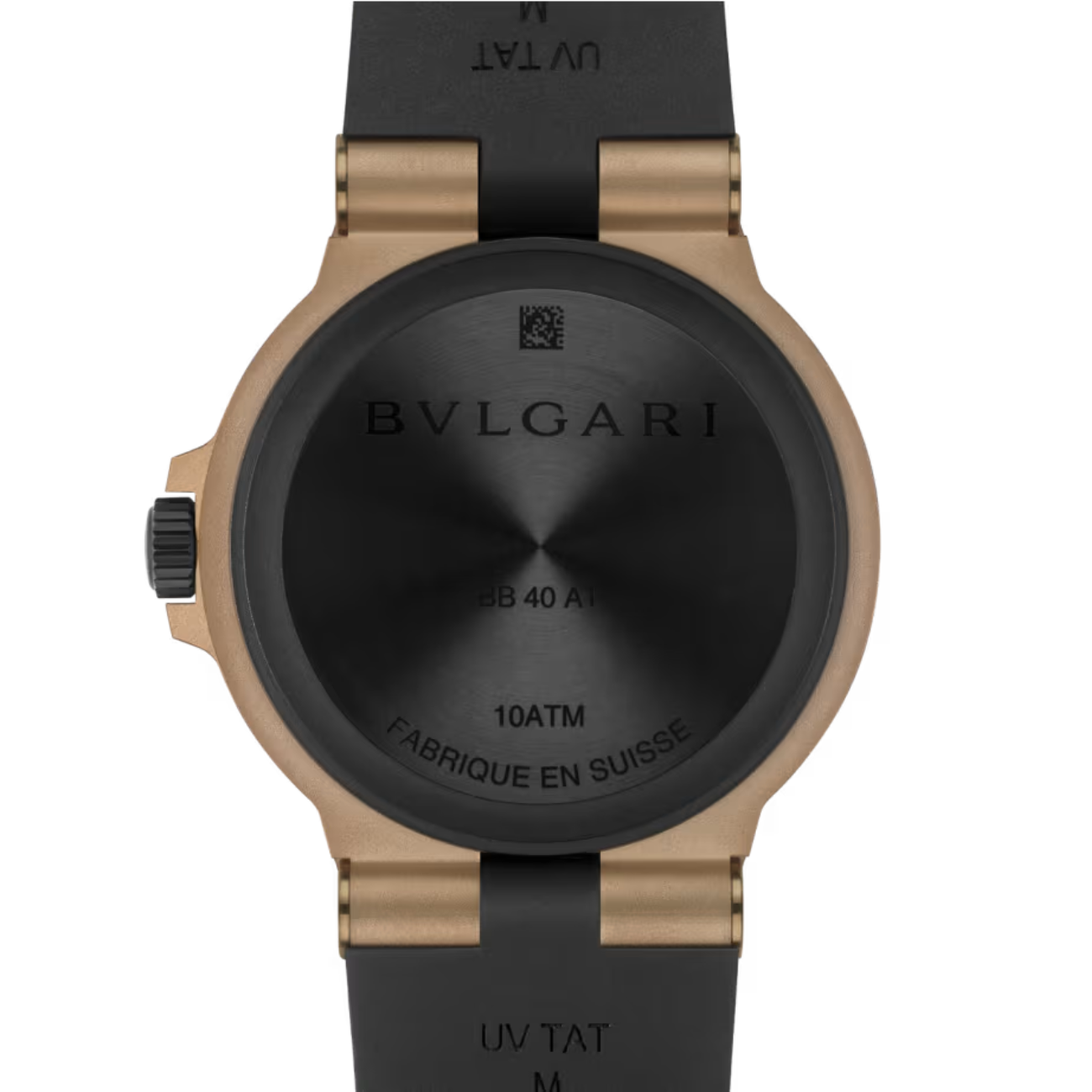 Boldly going beyond trends and eras, the Bvlgari Aluminium has redefined what a luxury sport watch can be since the first-generation models launched in 1998. A distinctive expression of the icon's unrivalled coolness and versatile appeal, this Bvlgari Bronzo GMT combines the warm, luxurious and timeless glow of bronze with the contemporary feel of black rubber, while the integrated GMT function adds a dynamic edge. Speaking a design language that is unmistakably Bvlgari, the timepiece approaches the watchmaking world with modern allure—a statement of character and innovative craftsmanship.