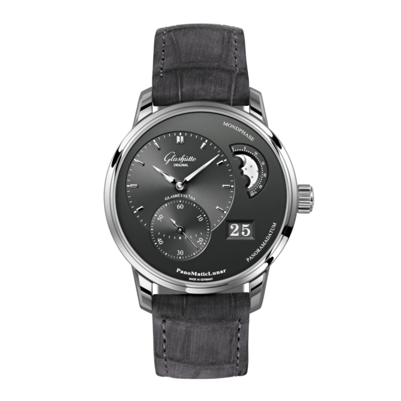 The stainless steel case of this mechanical watch for men is perfectly polished and satin-brushed and is 40mm in diameter. Its striking asymmetric visuals make this hand-crafted timepiece a feast for the eyes. This PanoMaticLunar comes with a choice of a grey Lousiana alligator nubuck leather strap, or a stainless steel bracelet with fine adjustment mechanism.