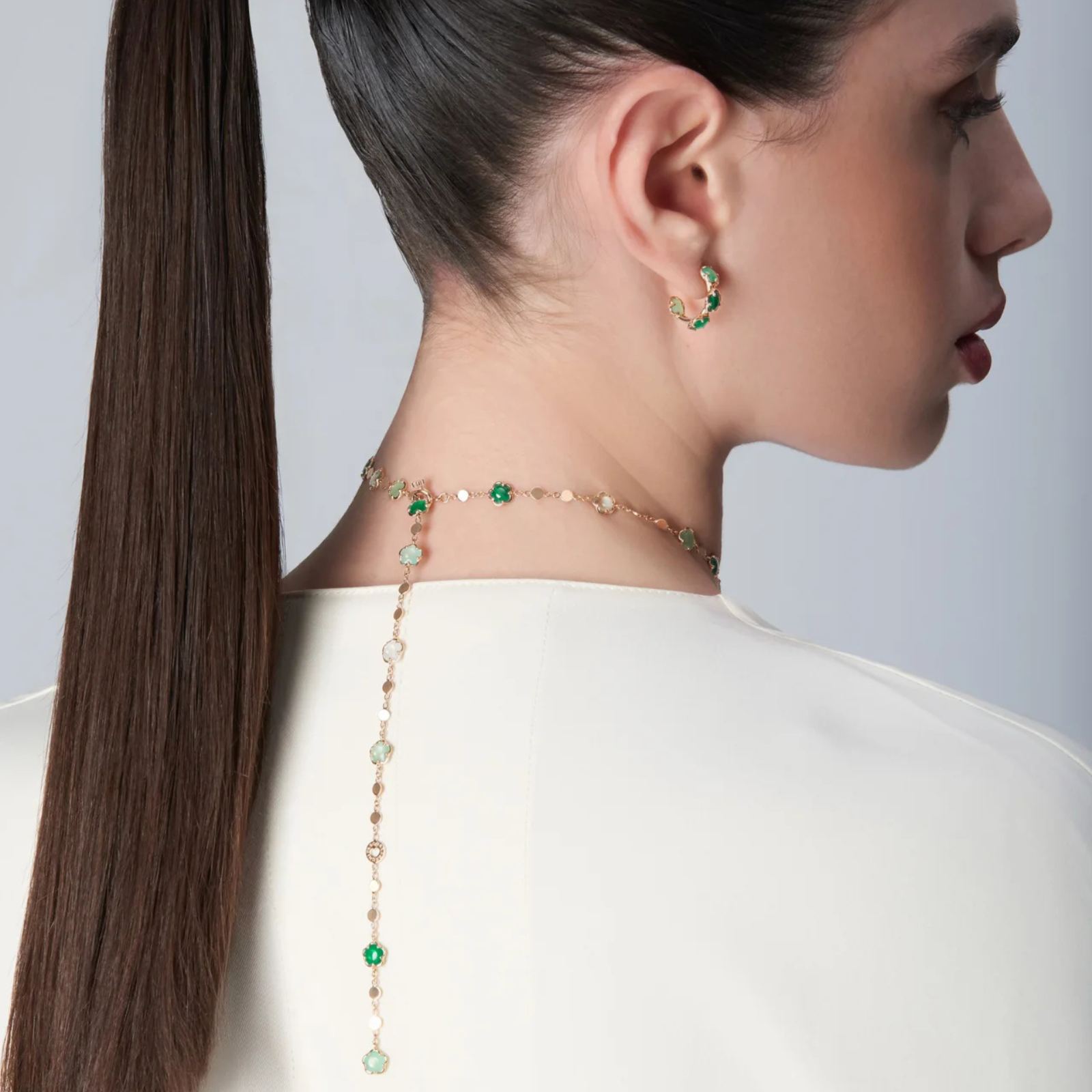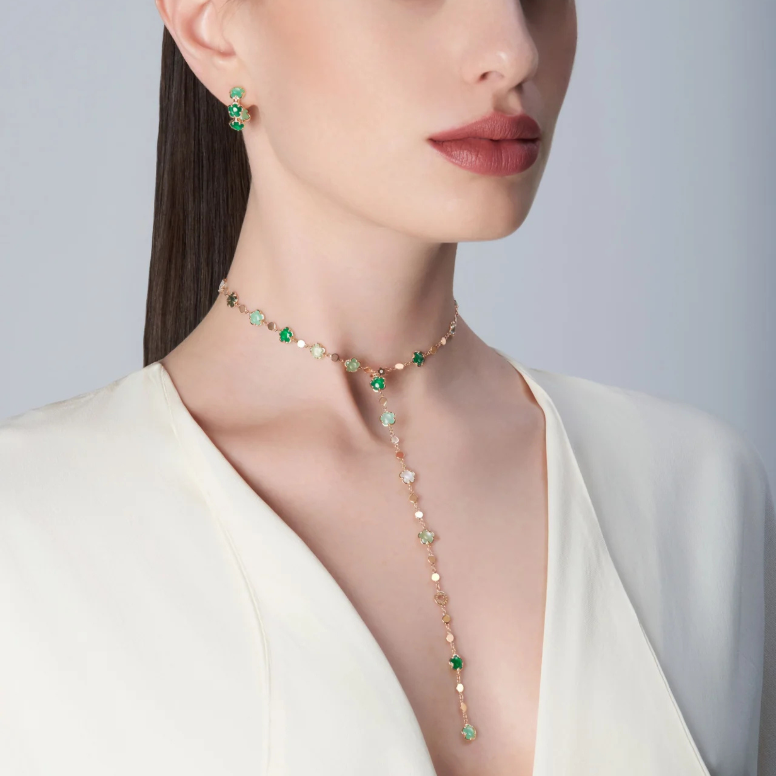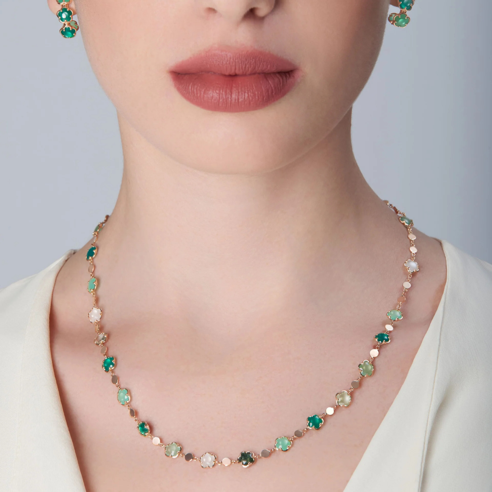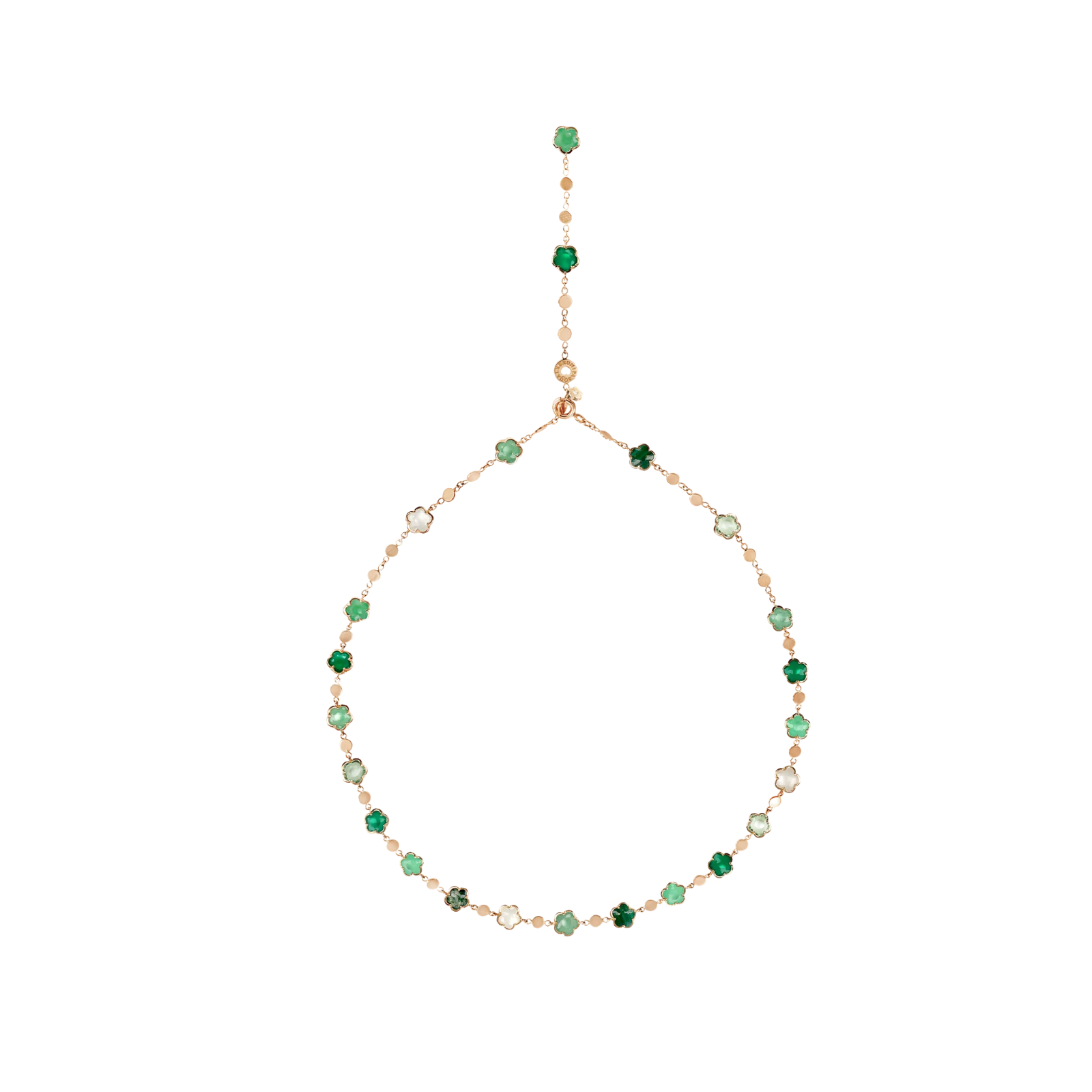 Necklace in 18k Rose Gold with Green Agate, White Moonstone, Malachite, Chrysoprase, Prasiolite, Green Aventurine, Moss Agate and Diamond.