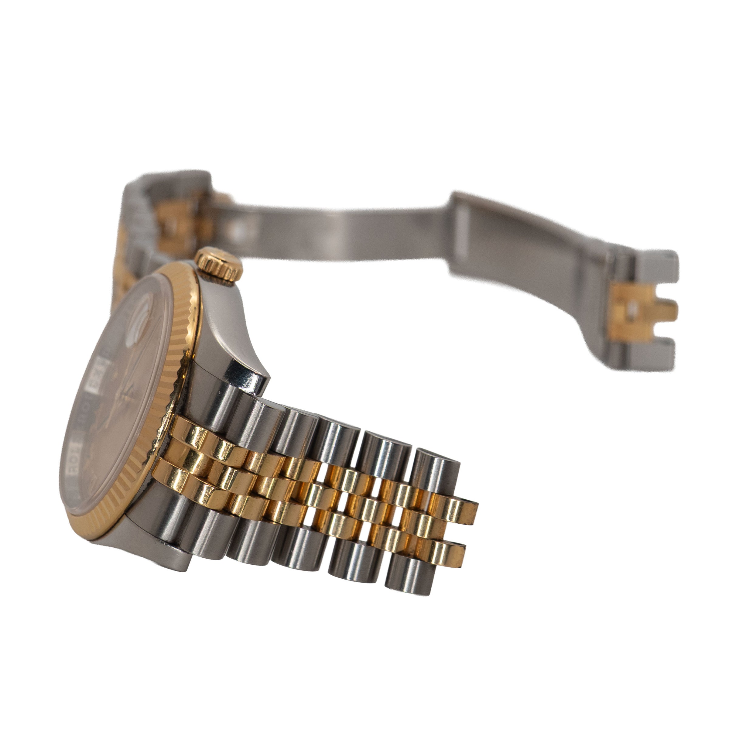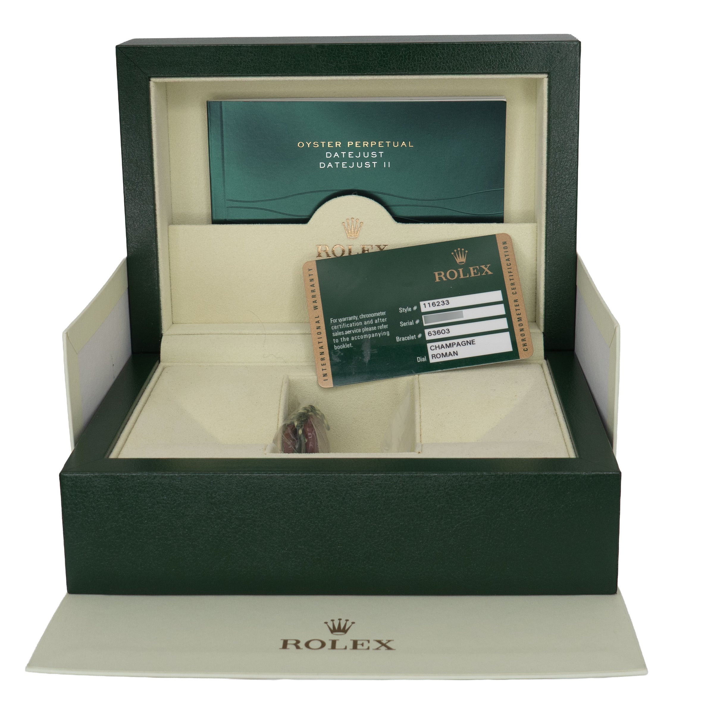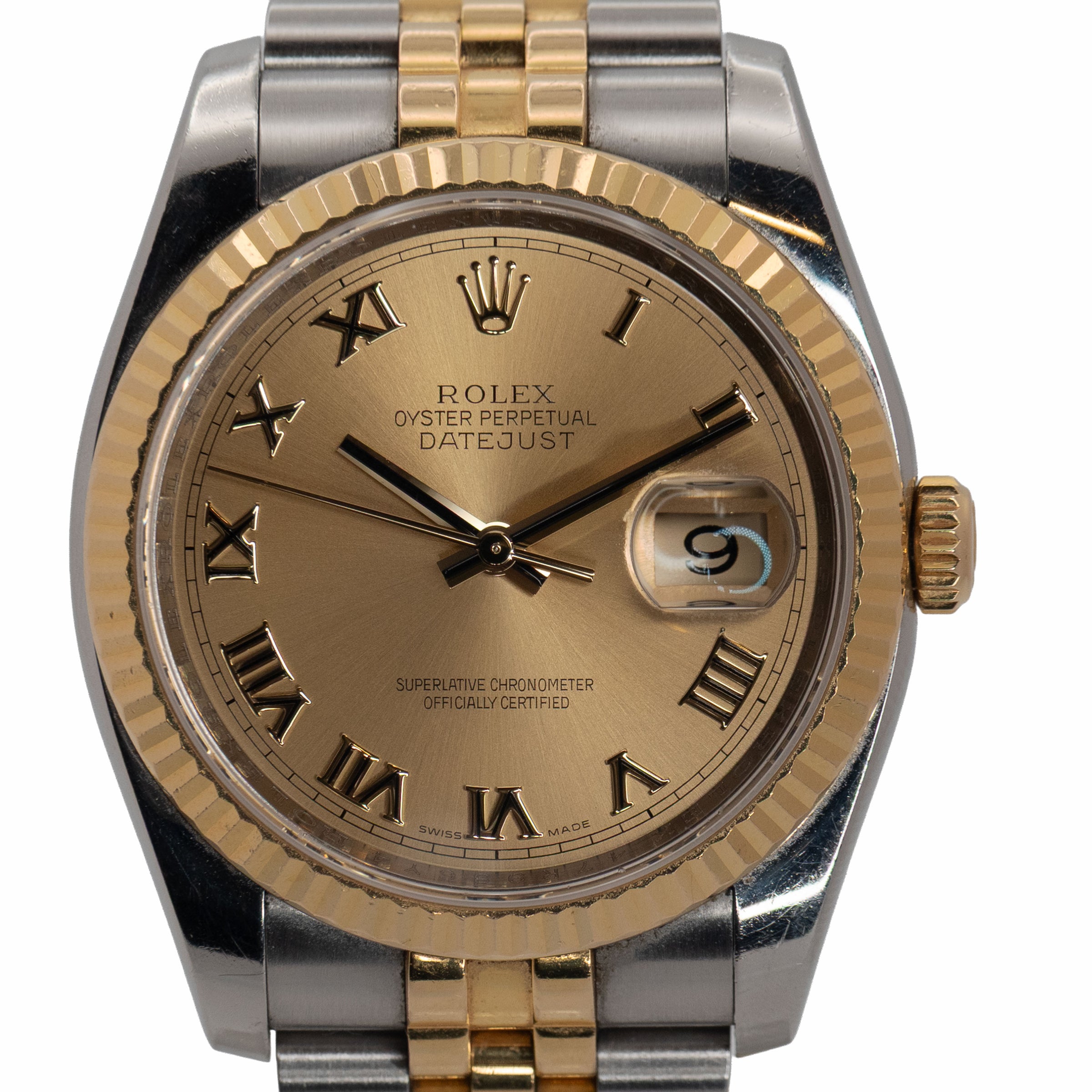 Dial: Champagne with gold roman numerals.