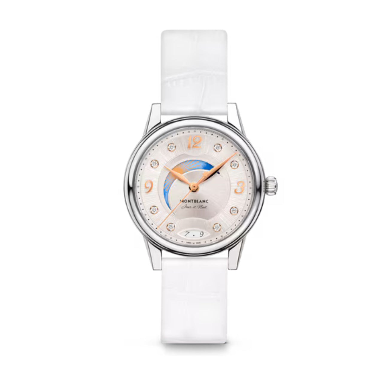 Interpreting the codes of fine watchmaking in an elegant and feminine way, the Montblanc Bohème Day & Night is inspired by the world of handwriting and watercolours and comes in a 34 mm stainless steel case. It features an elegant sunbrushed silver-white dial adorned with diamond indexes, rose gold-coated floral Arabic numerals and hands. Other refined details include a filet sauté pattern and a stamping technique called filé d’étoiles. Fitted with the automatic calibre MB 24.20, this model indicates the hours, minutes and seconds, as well as the date displayed in an almond-shaped aperture with handwritten numerals. The romantic font has also been applied to the dial for the day & night mention “Jour et Nuit”. The celestial day & night complication shows the changing sky over a period of 24h and brings a romantic and artistic touch to the timepiece as it is created with watercolours. This timepiece is fitted with an interchangeable white calf leather strap with alligator print and an additional strap.