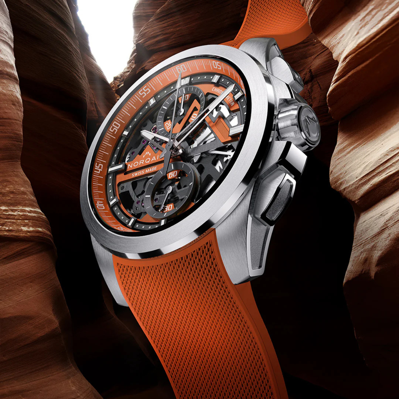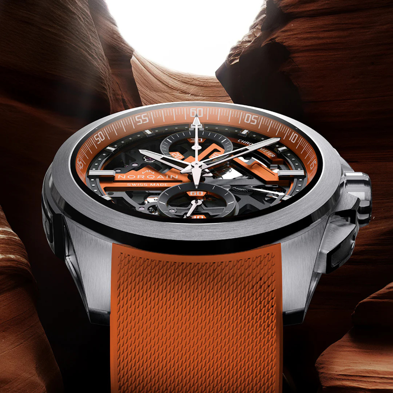 The Independence Skeleton Chrono is powered by the NORQAIN 8K Manufacture Calibre, an exclusive high-performance skeletonised flyback chronograph movement inspired by the world’s highest mountains.