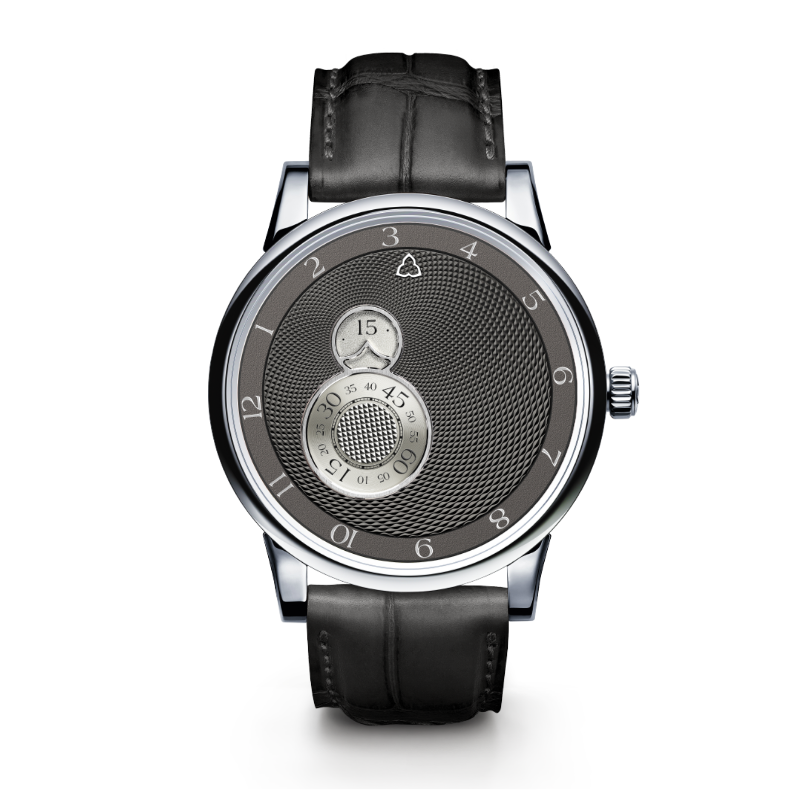 The largest ring for the hours; the minutes wheel that appears within an aperture and the seconds wheel, which alternates between a “Clous de Paris” centre and an azured ring.