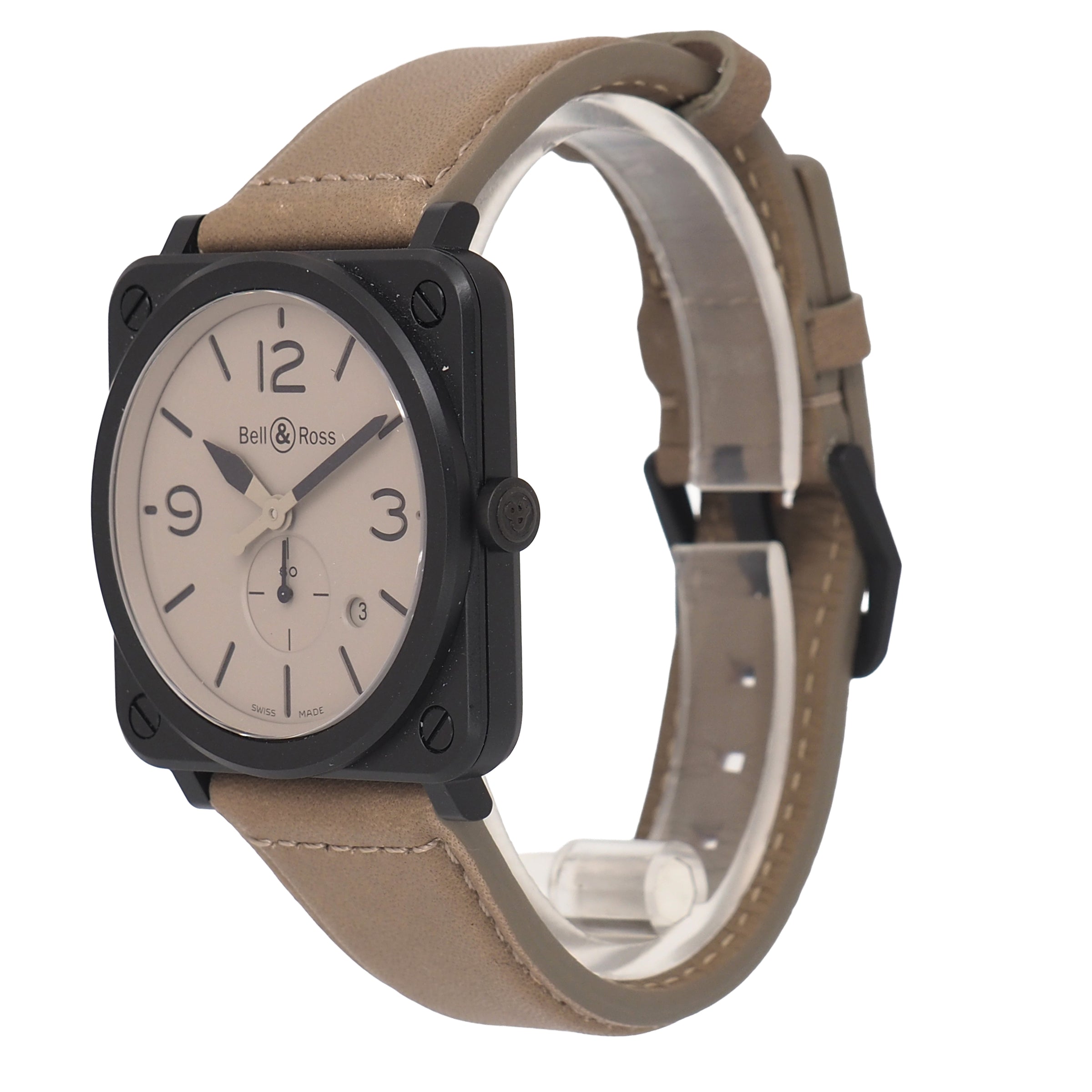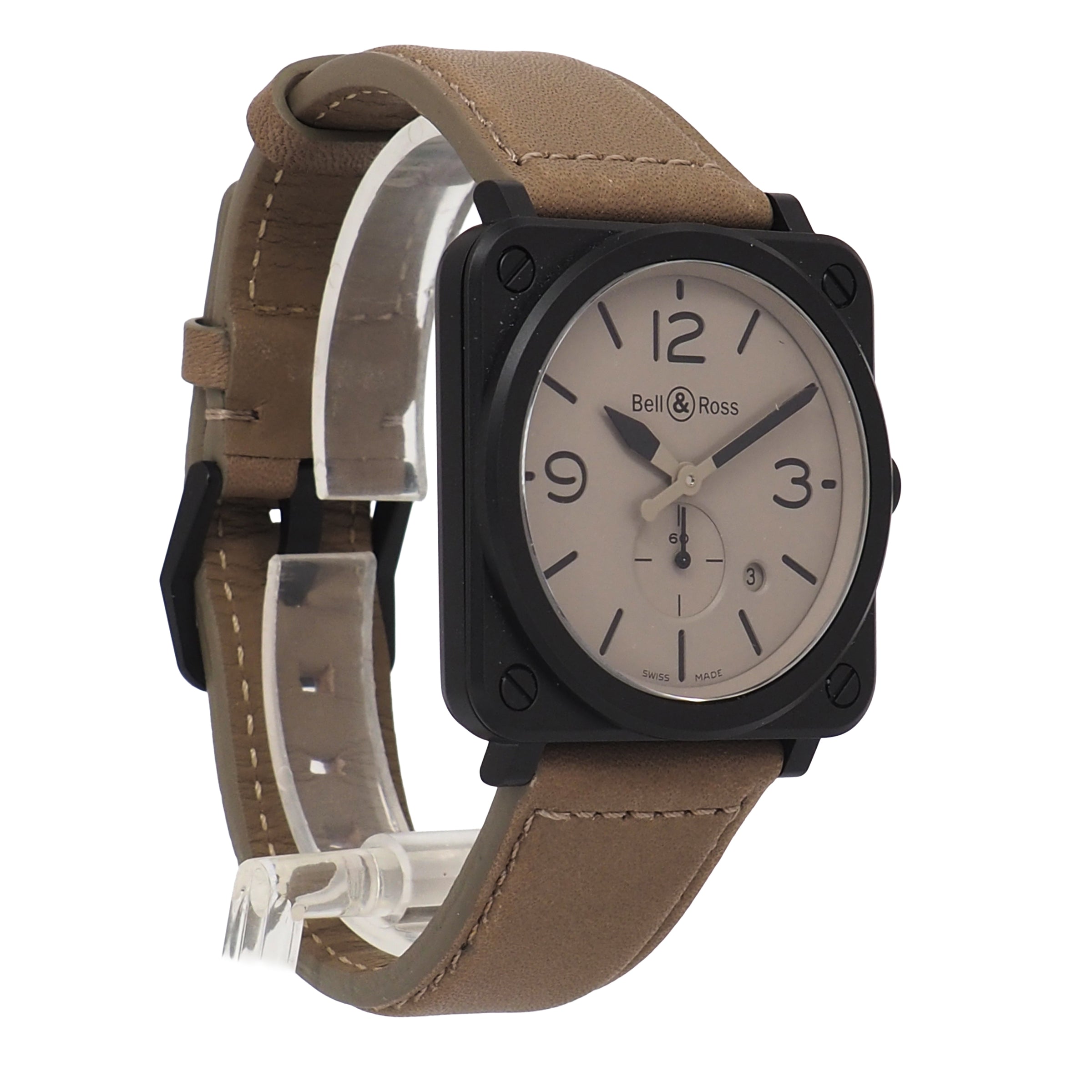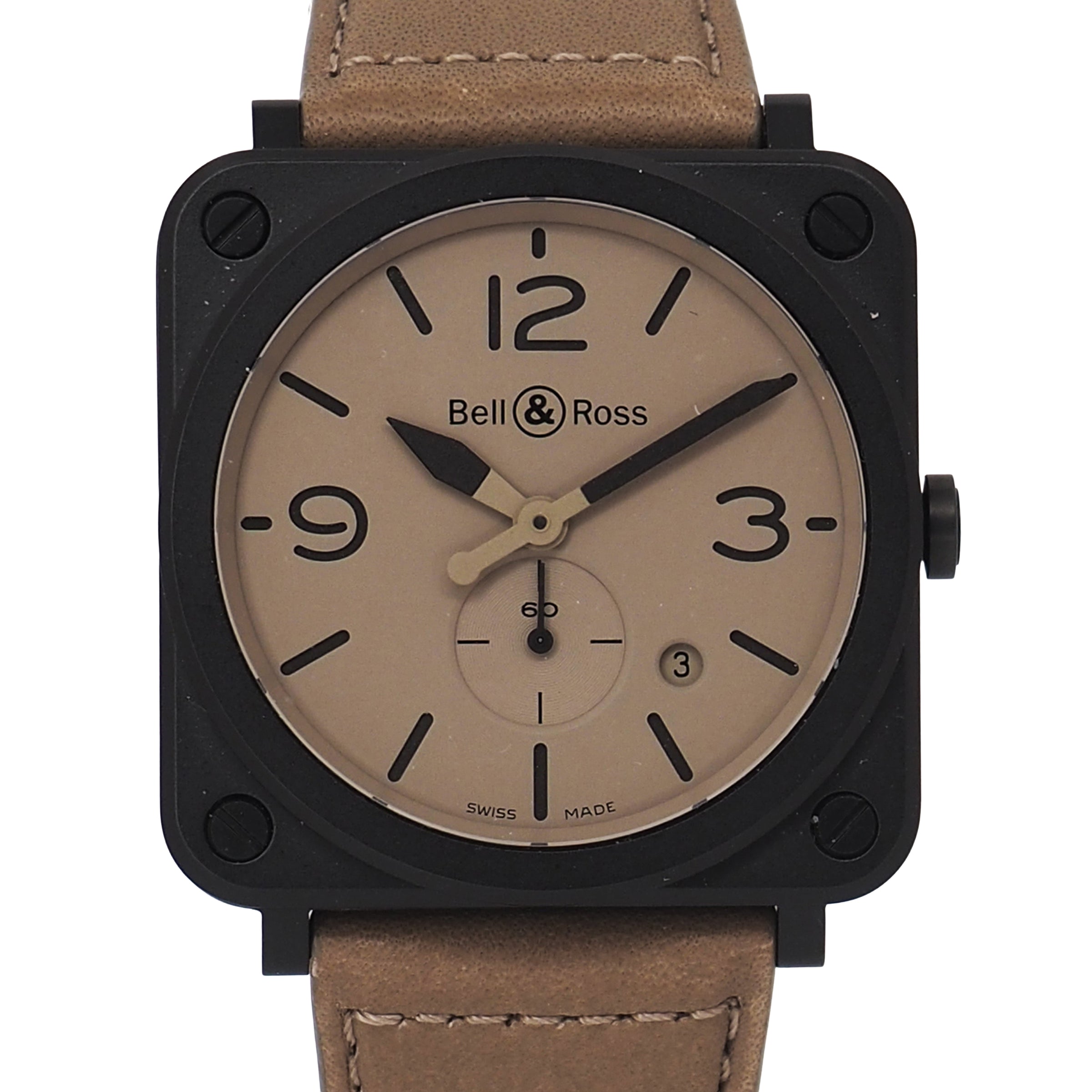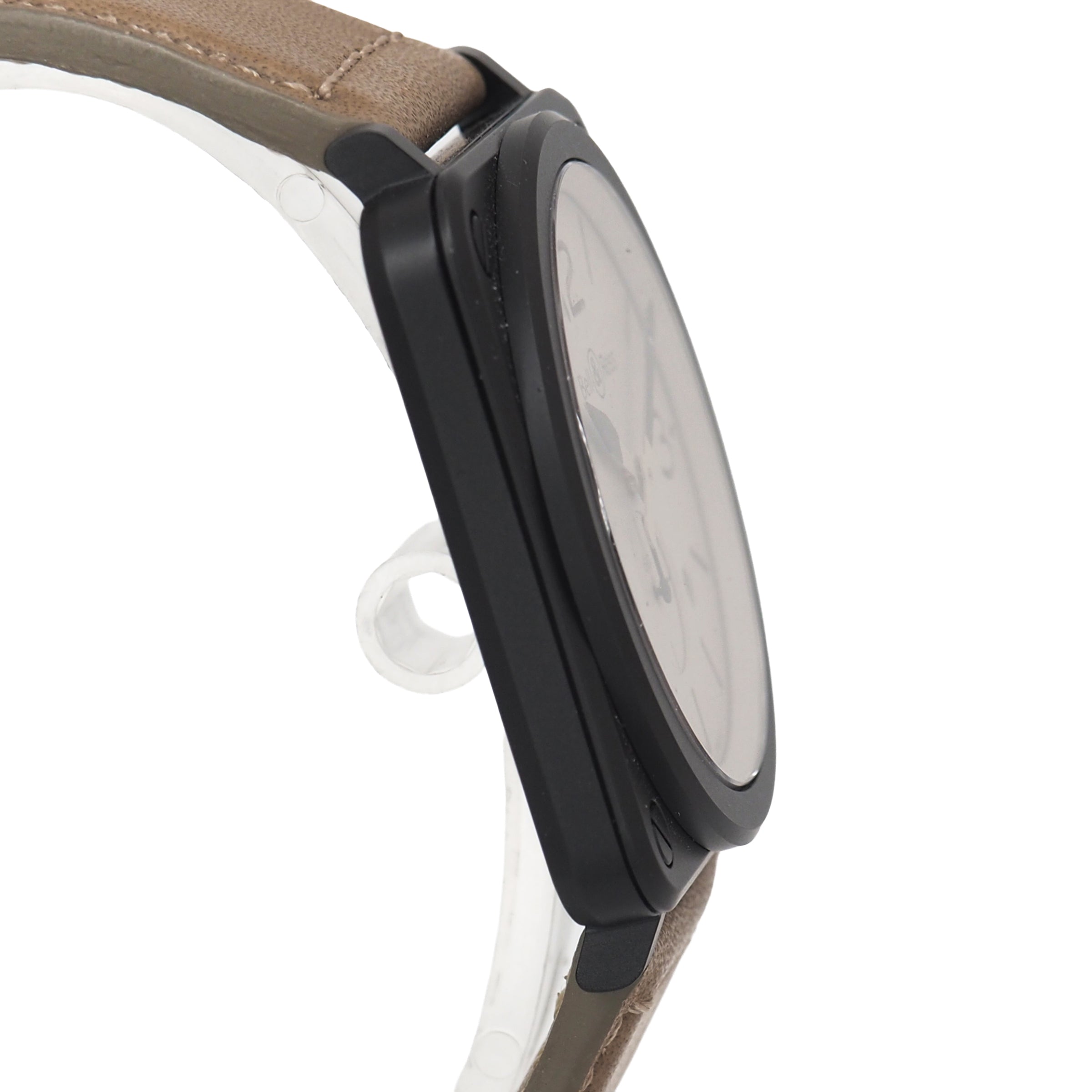 Embodying the rugged elegance of military instrumentation, the Bell & Ross Desert Type is a striking fusion of function and refined design. Housed in a matte black ceramic 39 mm case, this timepiece offers a bold, angular silhouette offset by its warm sand‑beige dial, drawing direct inspiration from desert aviation operations. The dial itself features cut‑out indices and numerals revealing a luminous underlayer, delivering strong legibility in both bright daylight and low‑light settings.
