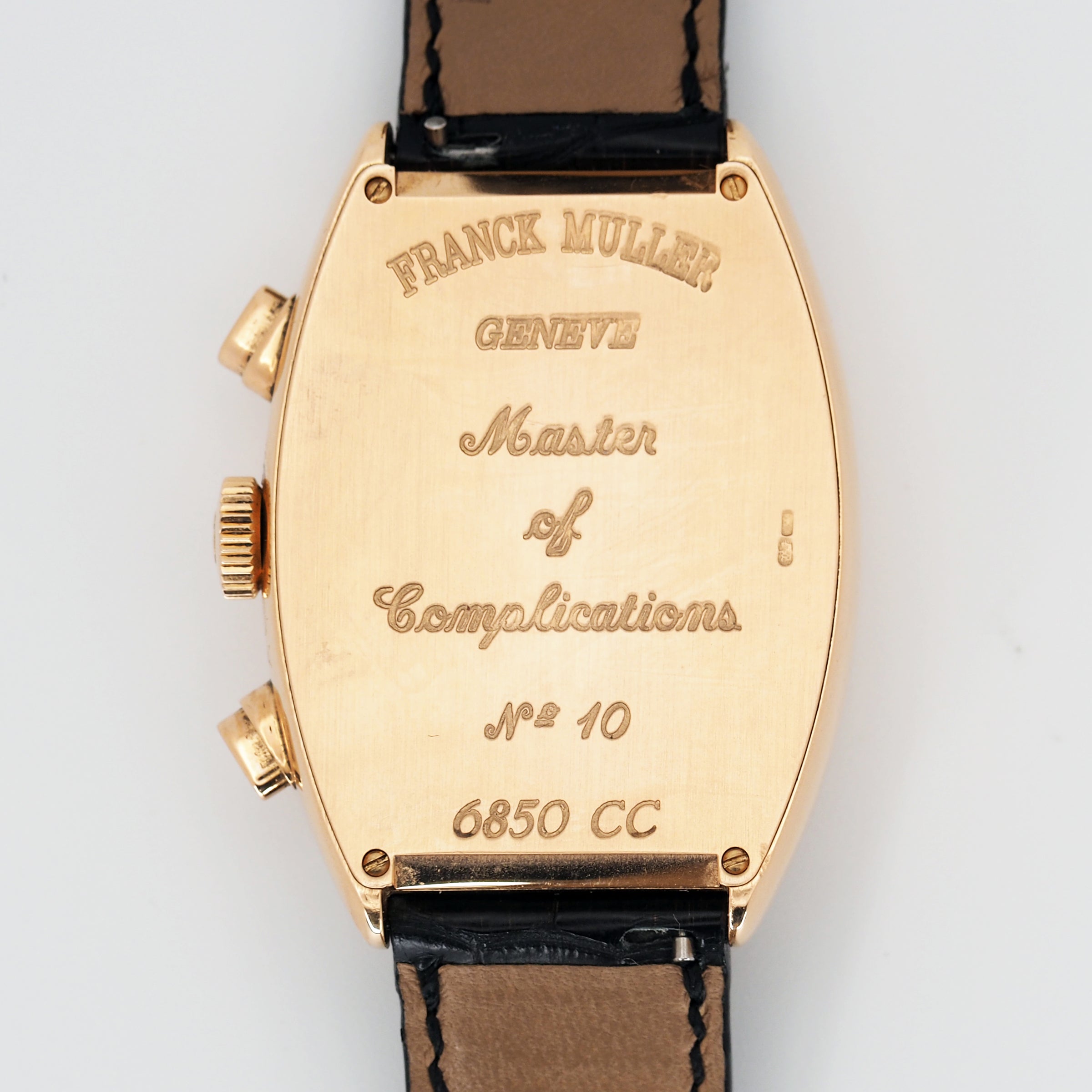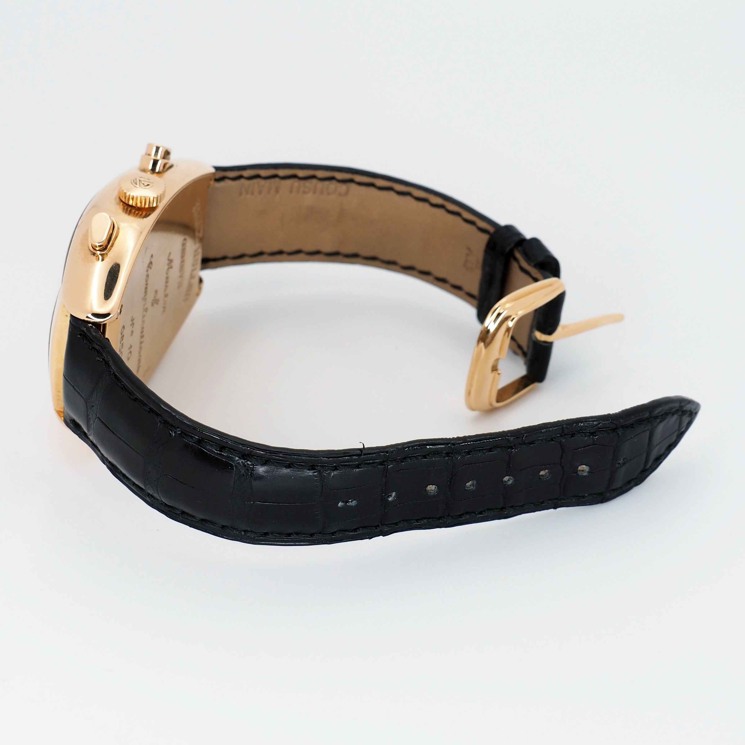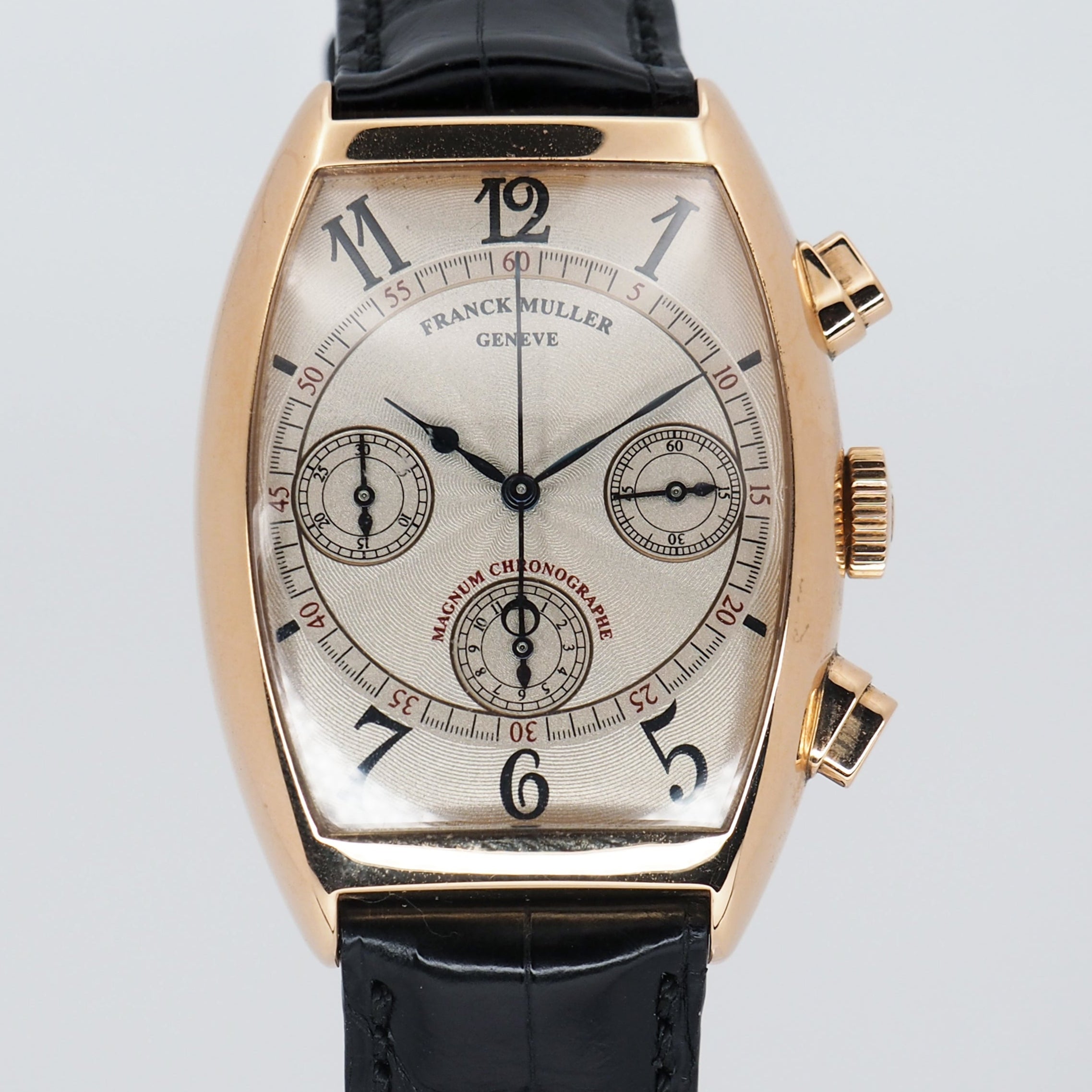 Experience the refined craftsmanship and bold elegance of the Franck Muller Magnum Chronograph Ref. 6850 CC, a luxury timepiece that embodies the brand's signature flair for innovation and sophistication. Crafted from solid 18K rose gold, this watch features a striking tonneau-shaped case that exudes both strength and style. The automatic mechanical movement powers a precision chronograph function, making it as functional as it is visually captivating. Its clean, analog display is housed under a curved sapphire crystal, offering a clear view of the dial’s fine detailing. This model is ideal for collectors and connoisseurs seeking a rare and distinguished chronograph with timeless appeal. Light wear consistent with gentle use adds character to this pre-owned piece, which remains in very good condition overall. A statement in both design and performance, the Franck Muller 6850 CC is a standout addition to any serious watch collection.