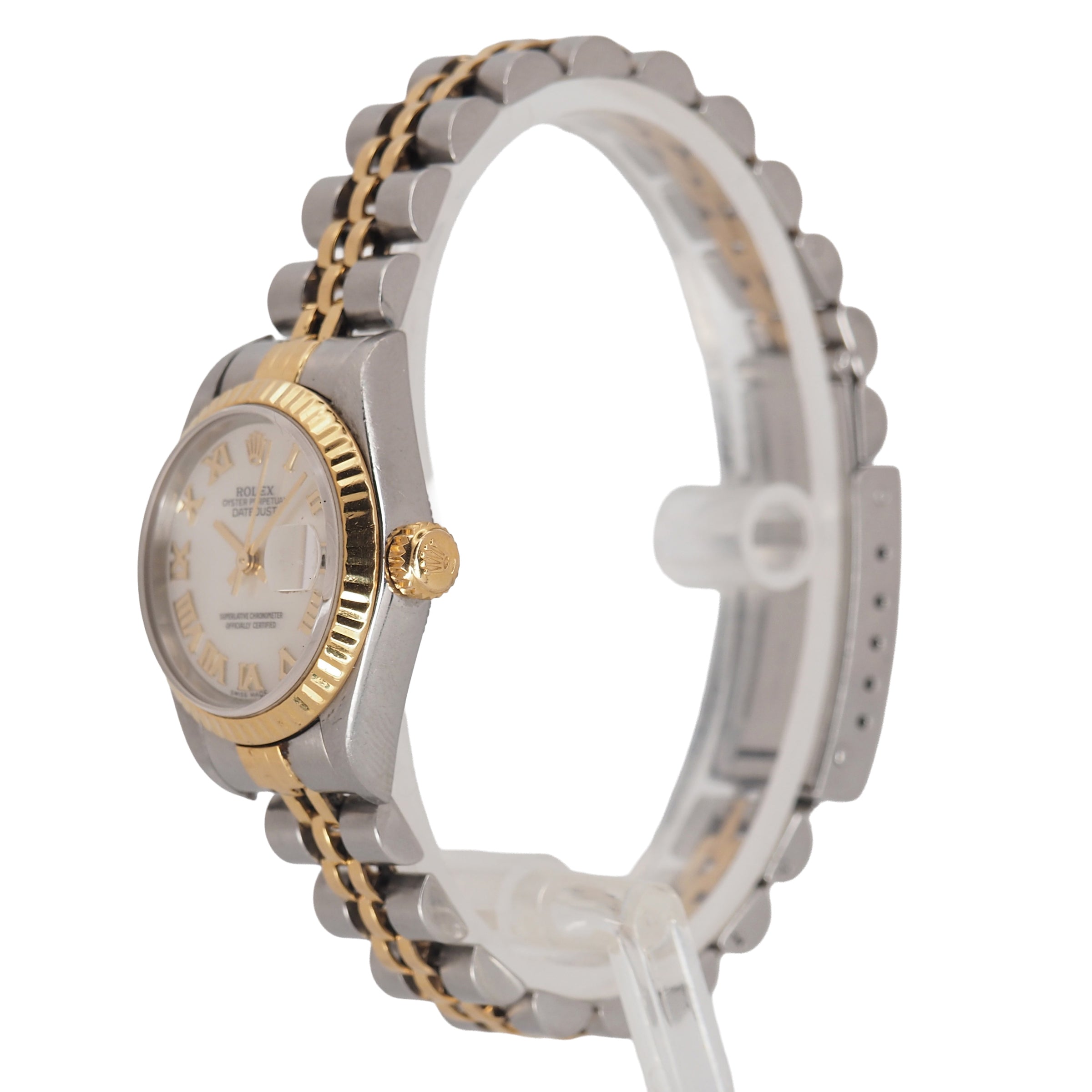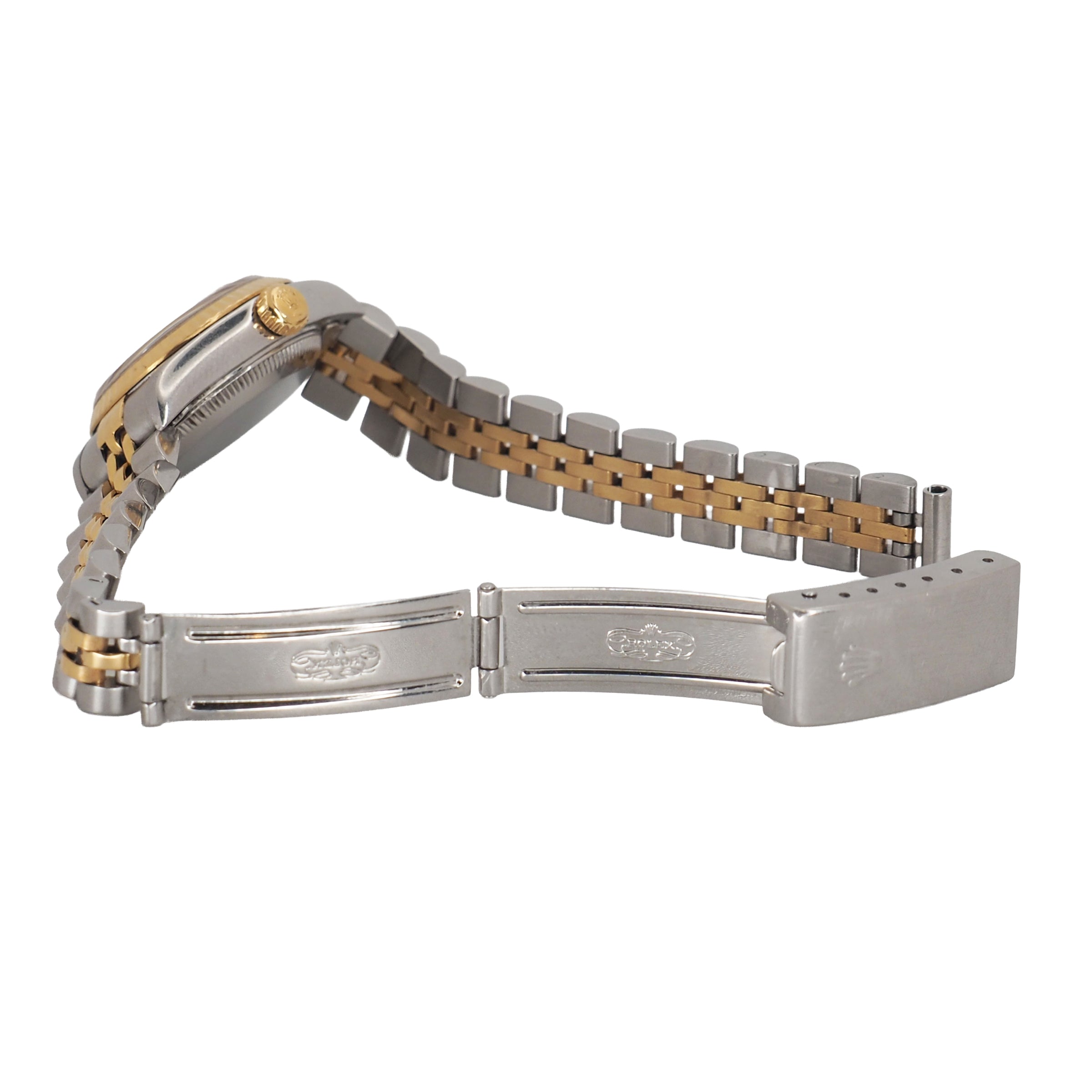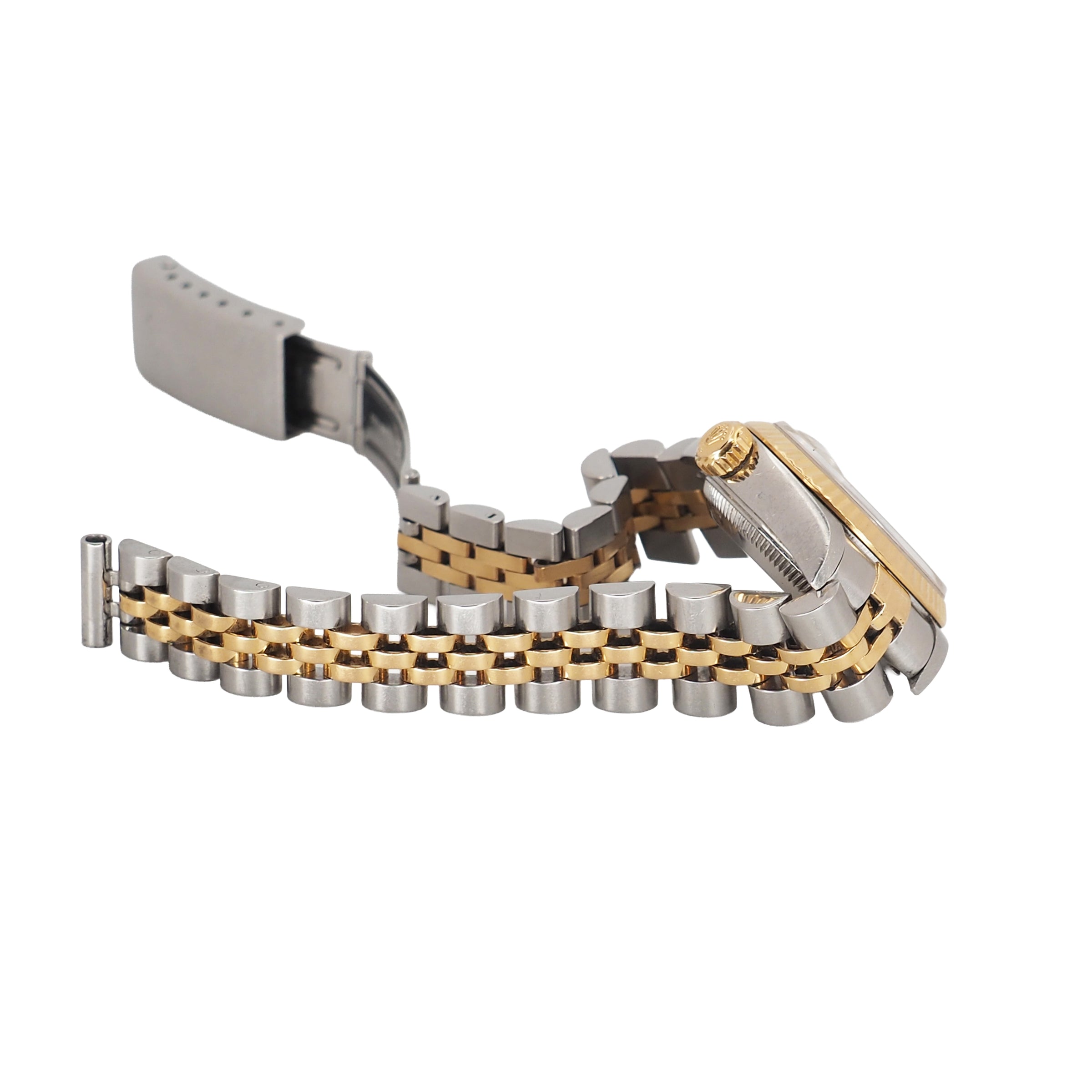 The Rolex Lady-Datejust 26mm Ref. 79193 is a timeless expression of classic Rolex design. Crafted from a blend of stainless steel and 18k yellow gold, this elegant two-tone watch showcases a fluted bezel and a refined Jubilee bracelet that exude sophistication. The mother of pearl dial features bold Roman numeral hour markers and the signature date display at 3 o’clock, capturing the perfect balance between luxury and everyday wearability.