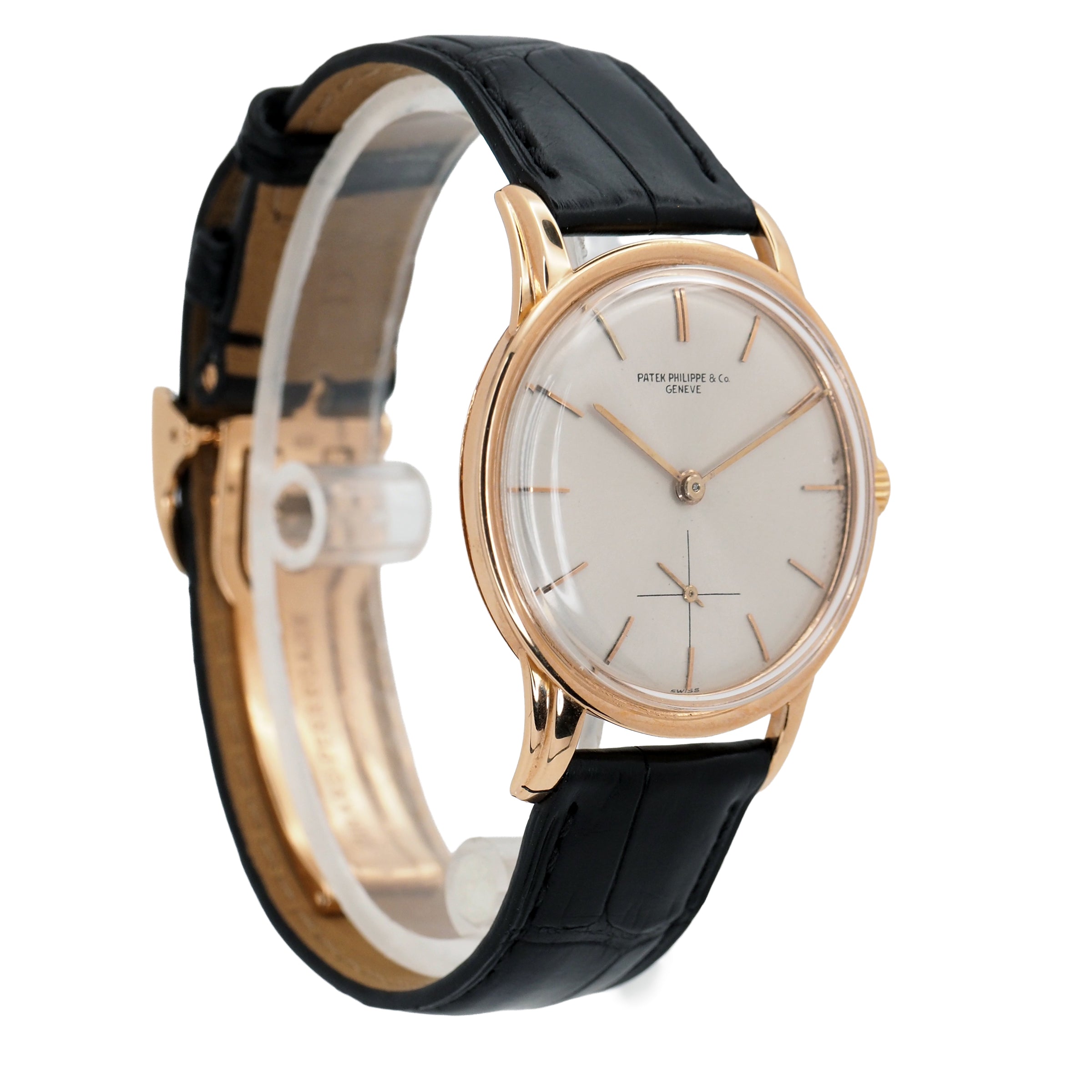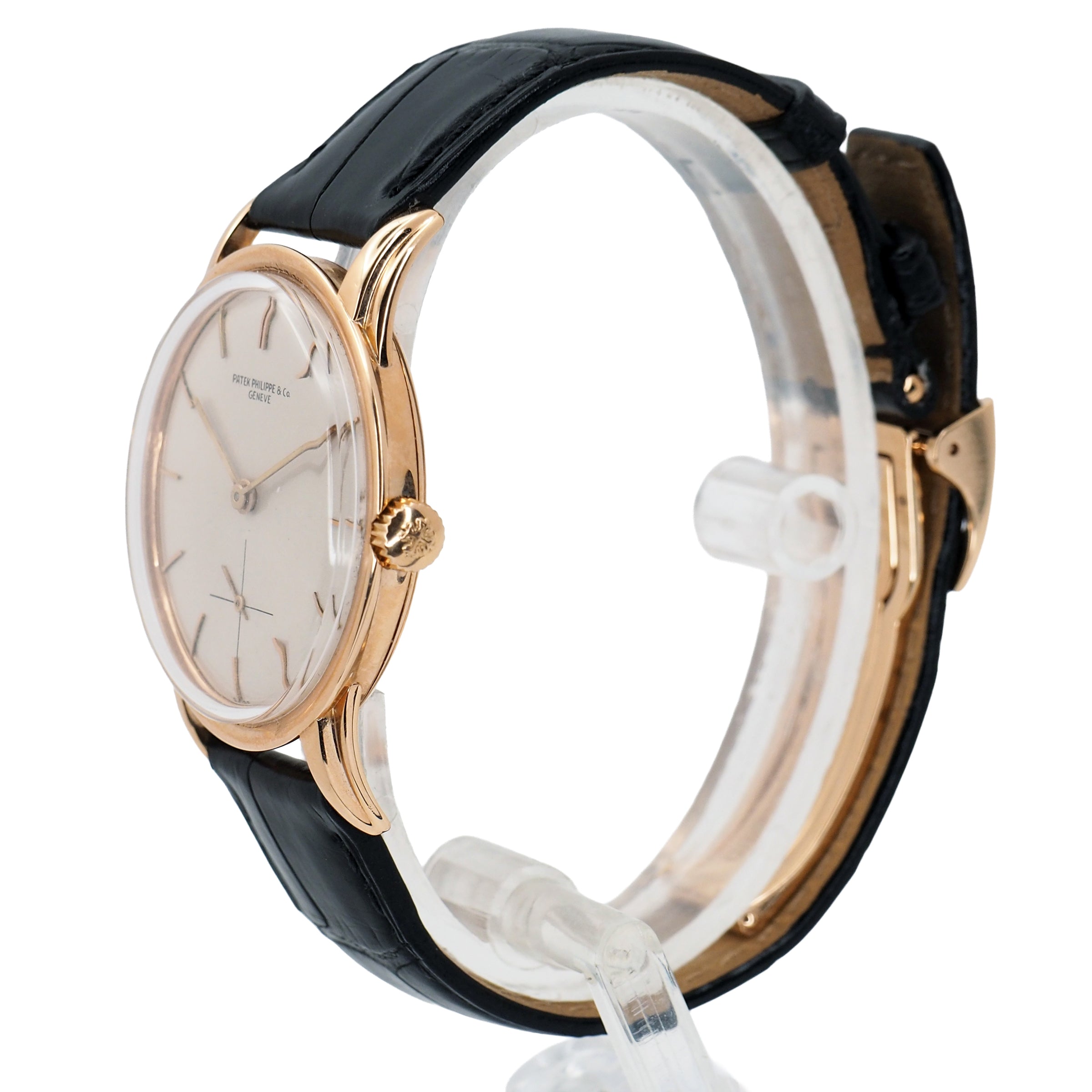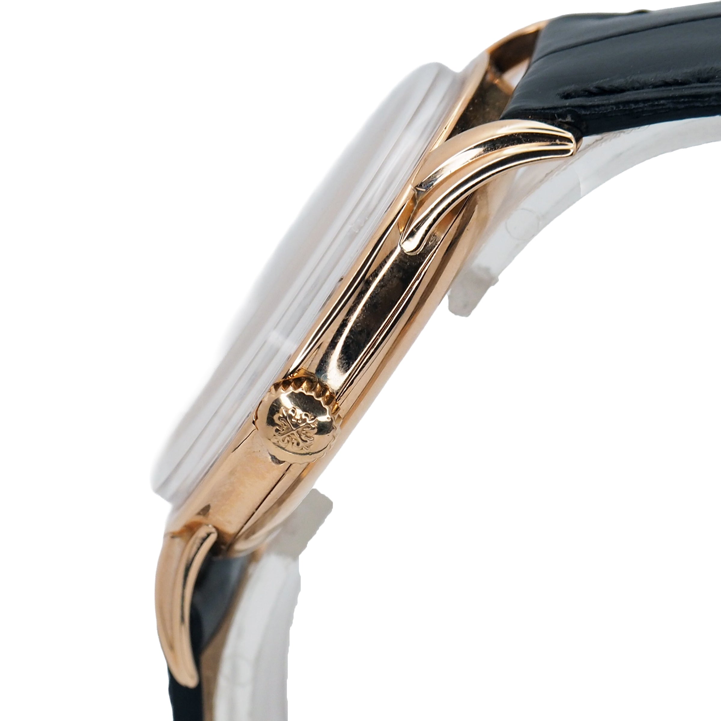 The Patek Philippe Calatrava Ref. 2452 in 18k rose gold is a masterclass in understated elegance. Introduced in the mid-20th century, this reference showcases a unique blend of architectural detail and classical refinement that has come to define Patek’s Calatrava line. The 35mm case, rendered in warm rose gold, features a distinctive stepped profile with a concave bezel and elegantly downturned lugs — design elements that give it a presence far beyond its modest dimensions.