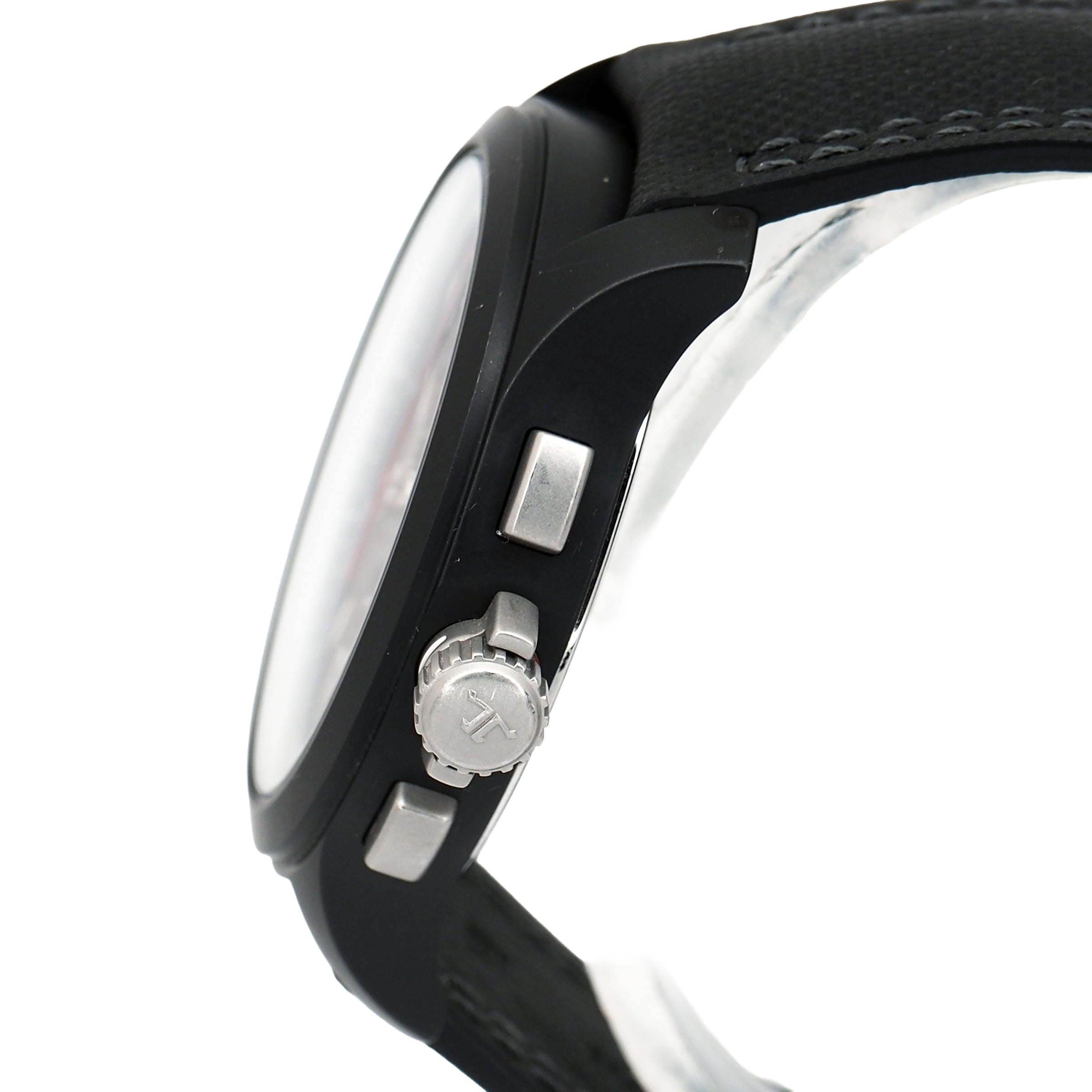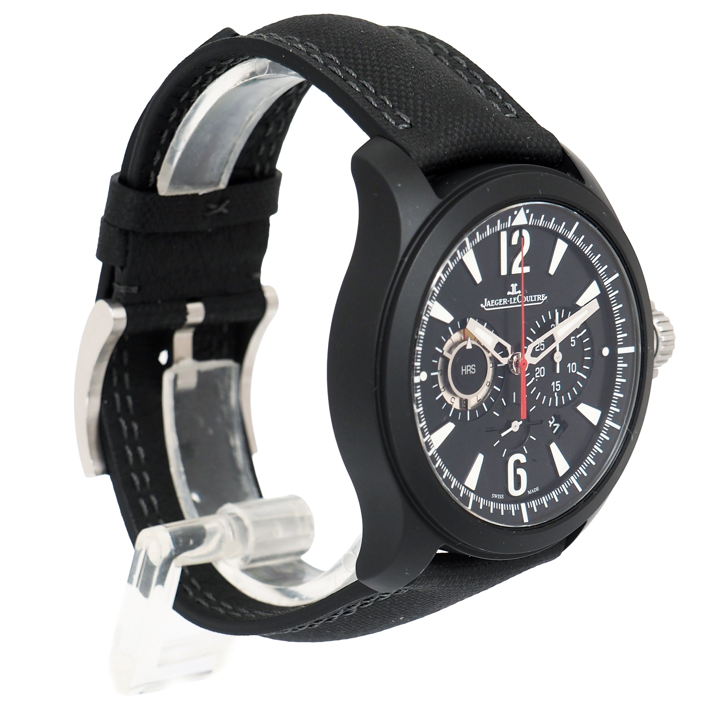At 44mm, the case pairs brushed stainless steel with a matte black ceramic bezel, offering both robustness and a striking visual contrast. The black dial is clean and functional, featuring luminescent markers, twin chronograph registers, and a discreet date display at 4:30. Powered by Jaeger-LeCoultre’s in-house automatic chronograph movement, the watch delivers both mechanical reliability and high-end finishing — qualities that define the manufacture’s reputation.