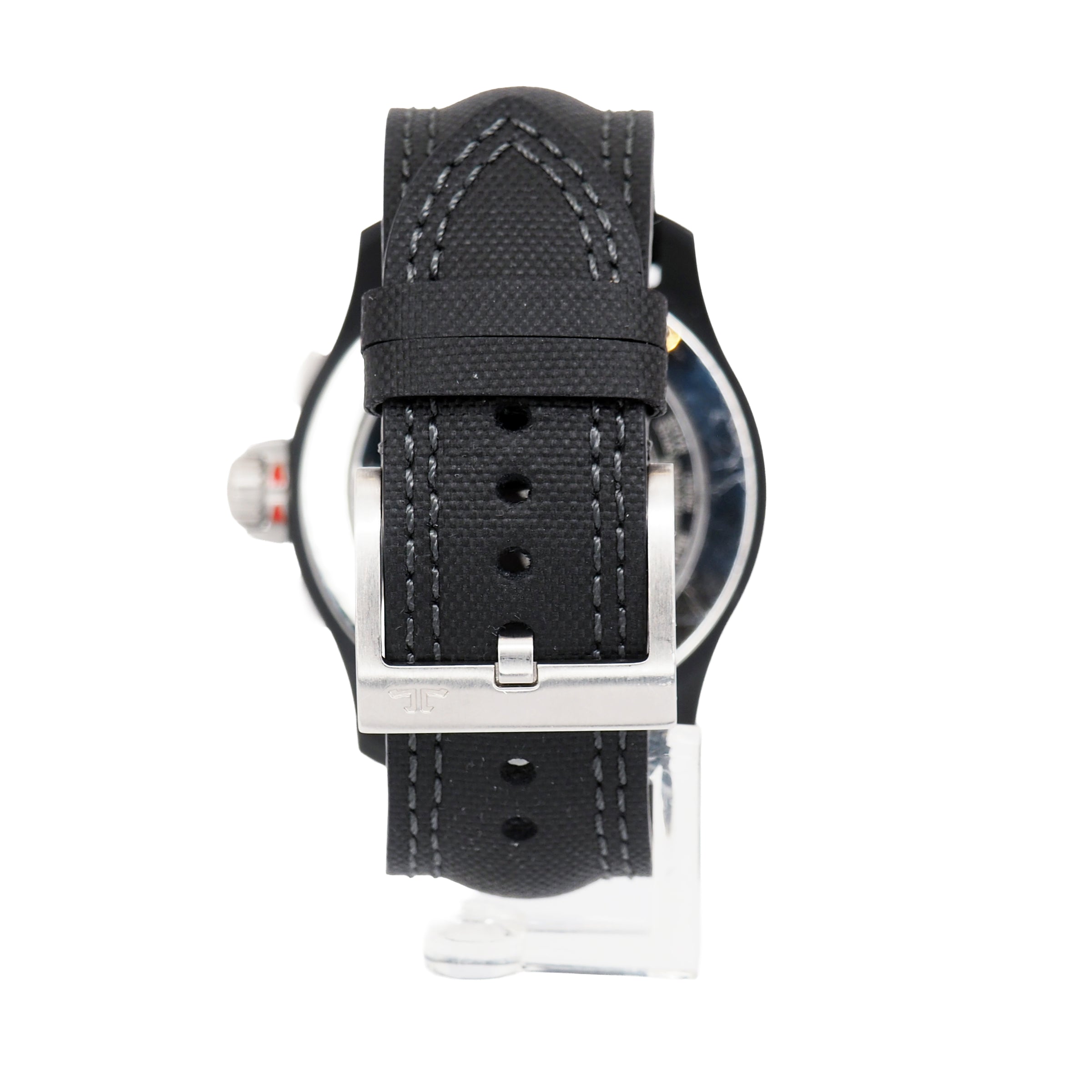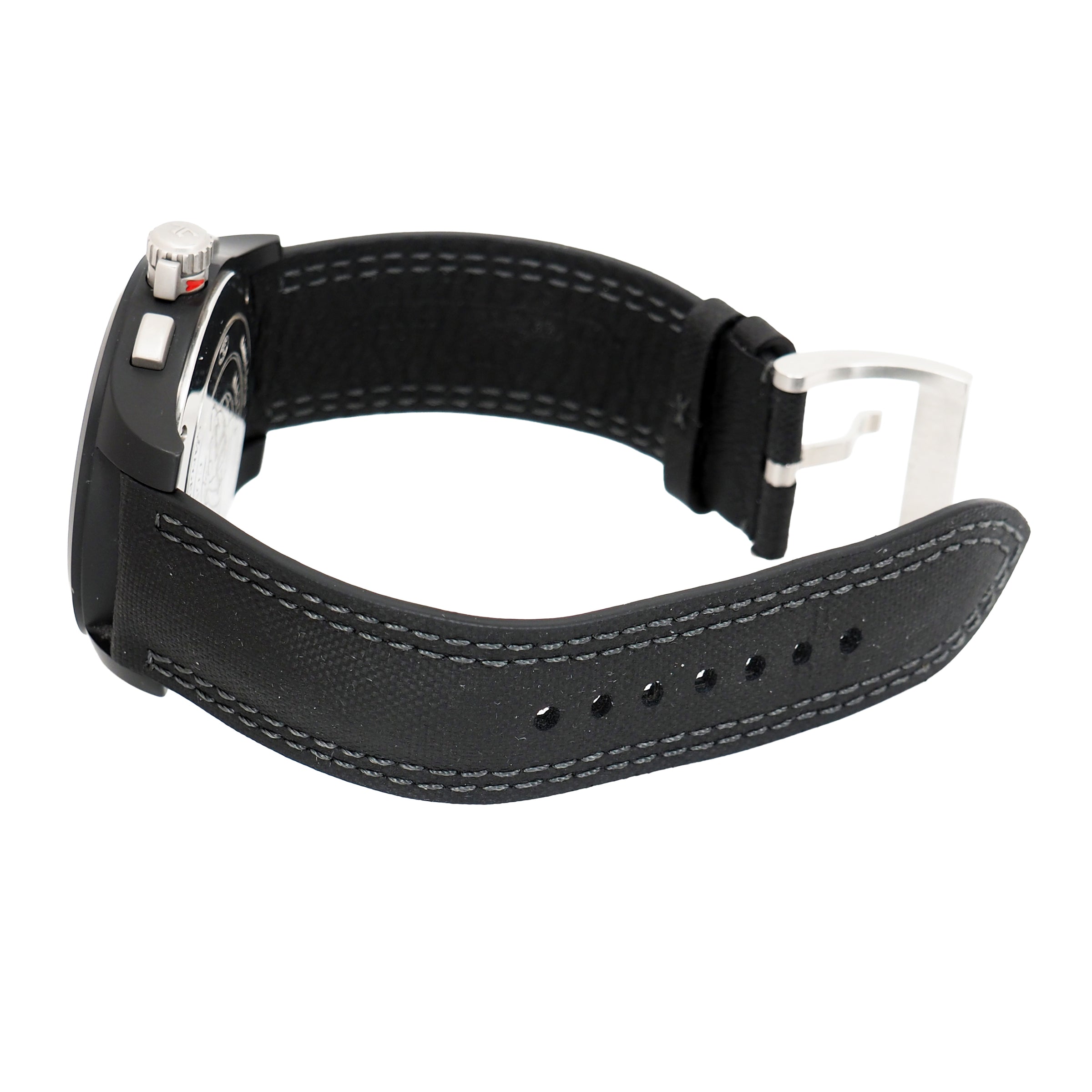 Bracelet: Black nylon and leather strap with stainless steel buckle.