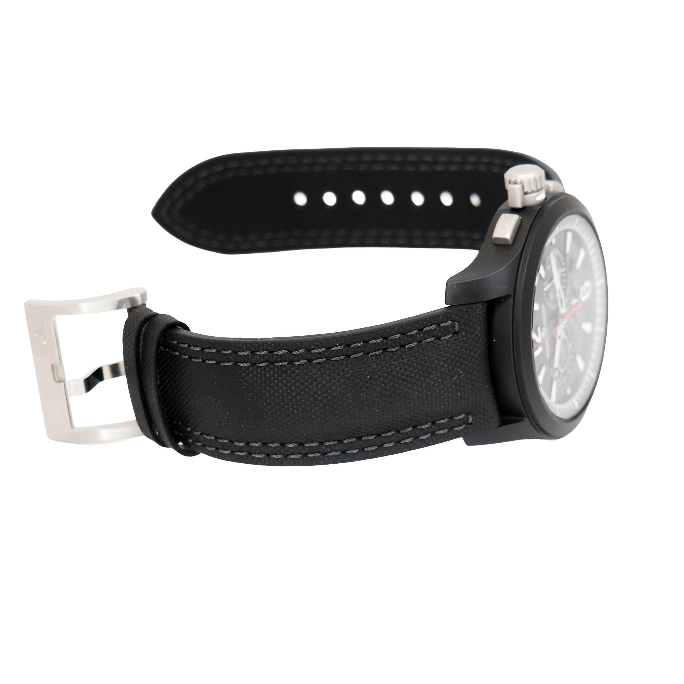Dial: Black dial with raised luminous index hour markers and arabic numerals at 6 and 12. Date display between 4 and 5 o'clock. Three chronograph sub-dials -- 60 second, 30 minute and 12 hour.