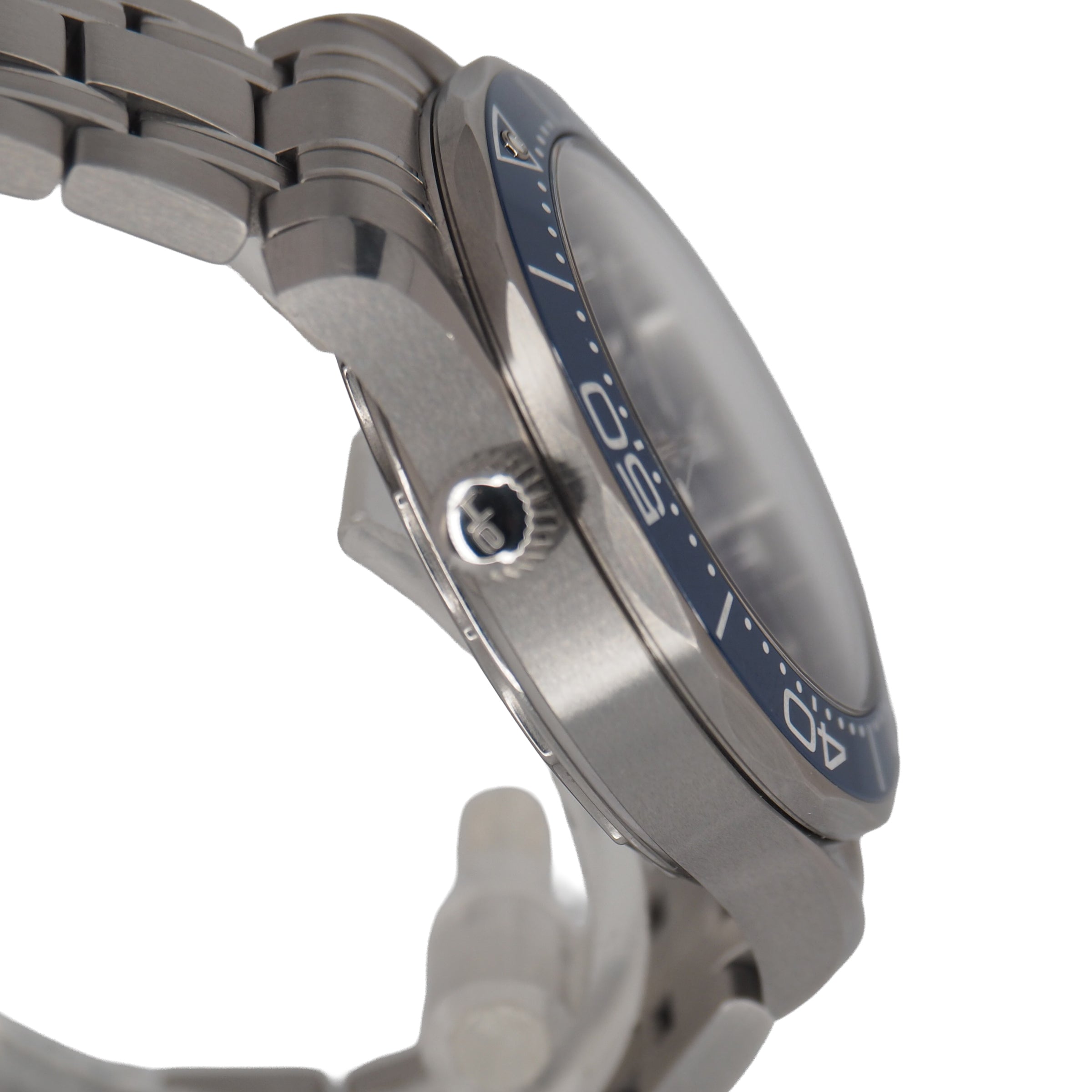 This 42 mm model is crafted from stainless steel and includes a blue ceramic bezel with a white enamel diving scale. The dial is also polished blue ceramic and features laser-engraved waves and a date window at 6 o’clock.