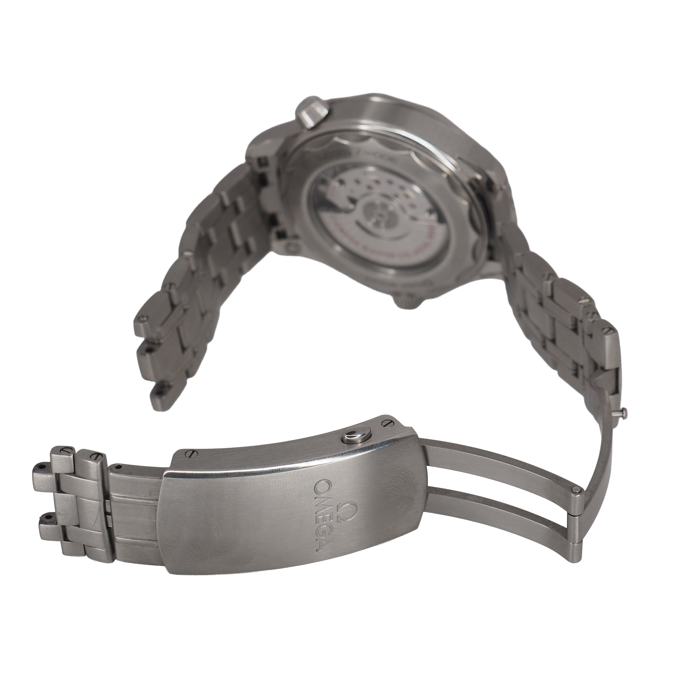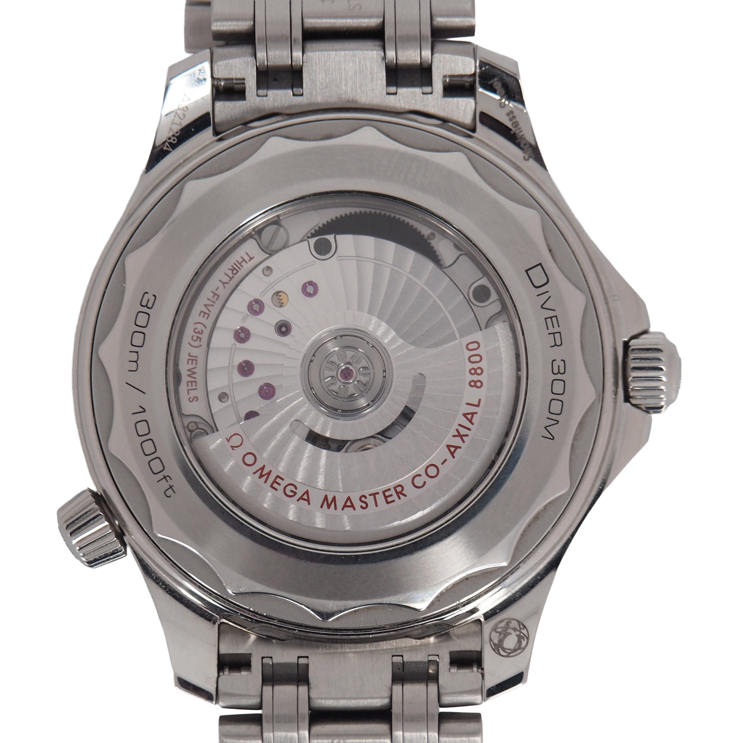 The watch is presented on a stainless steel bracelet and is driven by the OMEGA Master Chronometer Calibre 8800, which can be seen through the sapphire-crystal on the wave-edged caseback.