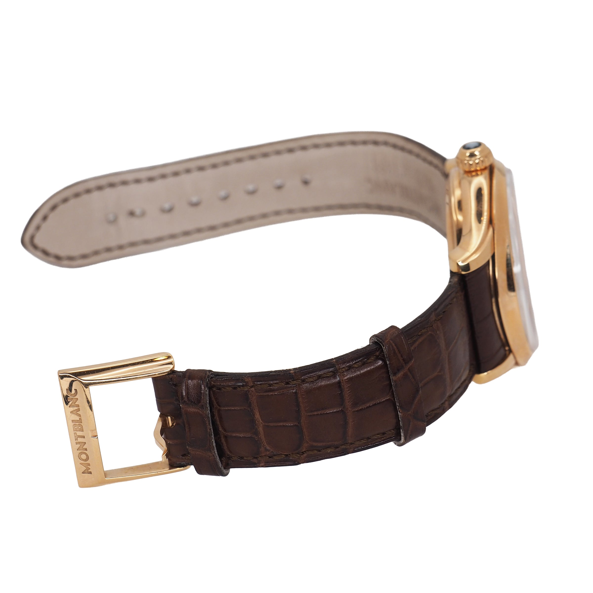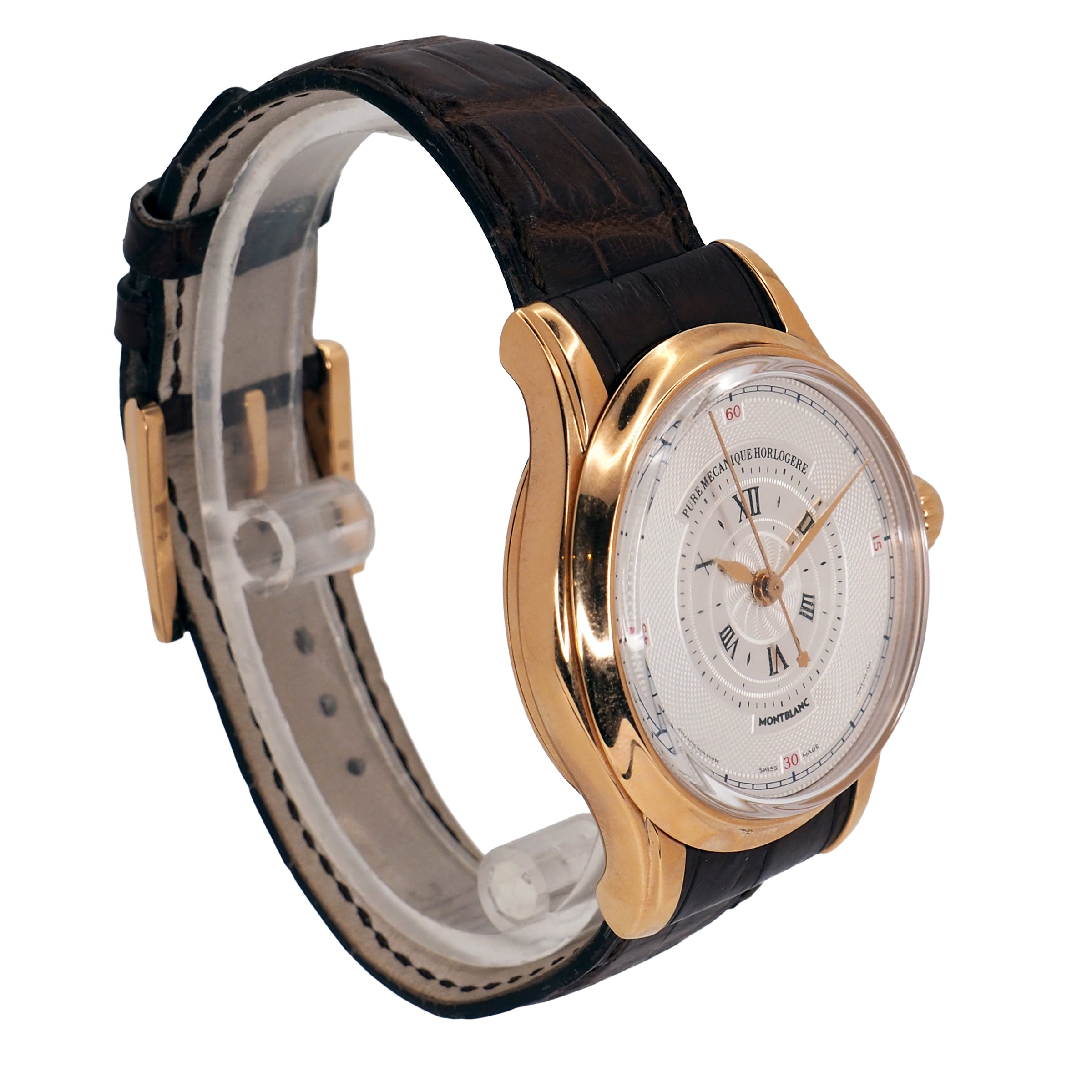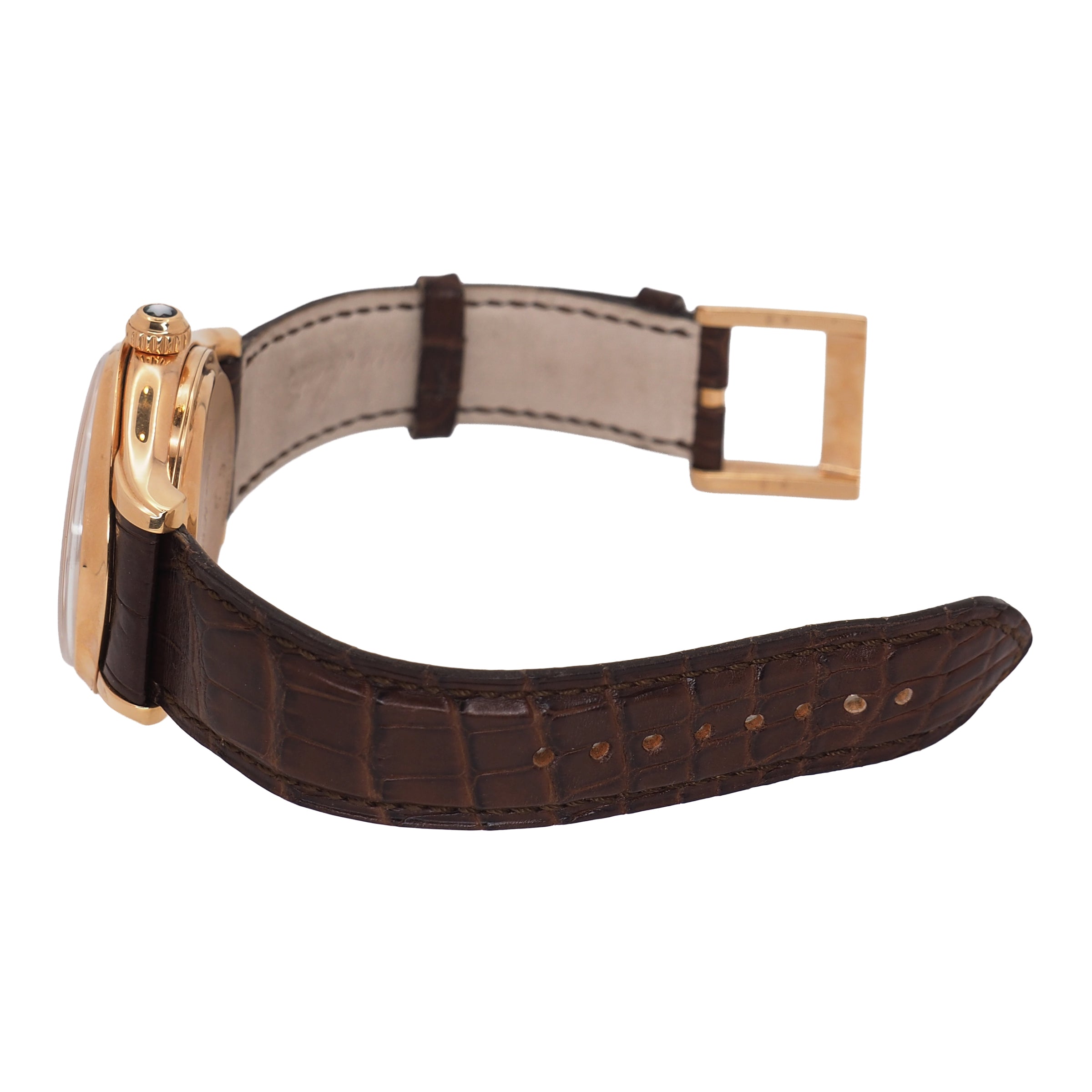 The Montblanc Villeret Ref. 103837 is a masterclass in traditional watchmaking, combining classical design with exquisite craftsmanship. Encased in polished 18k rose gold, its 41mm case makes a confident yet refined statement on the wrist. The warm tone of the gold pairs beautifully with a silver dial, creating a timeless aesthetic that speaks to elegance and sophistication. A sapphire crystal protects the dial, ensuring clarity and resistance to scratches, while the manual winding movement inside reinforces the connection between wearer and watch — a nod to the artistry of mechanical horology. This timepiece is fitted with a luxurious brown crocodile leather strap, secured by a traditional buckle, offering both comfort and style. With a water resistance of 3 ATM, it is well-suited to everyday elegance though not designed for immersion. This particular example comes in very good pre-owned condition, showing only minimal signs of wear, and includes the original box and papers, enhancing its collectibility and provenance. The Montblanc Villeret is the ideal choice for a discerning collector or enthusiast who values timeless design, fine mechanics, and the enduring appeal of Swiss tradition.