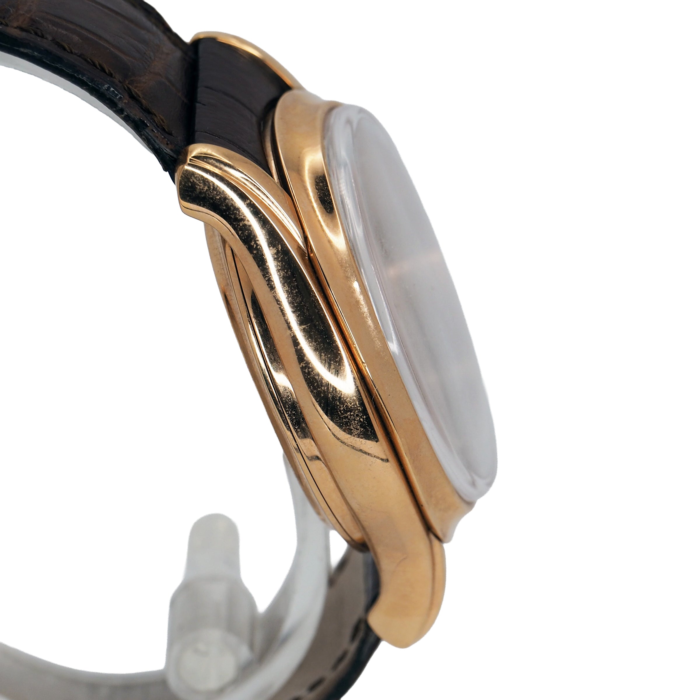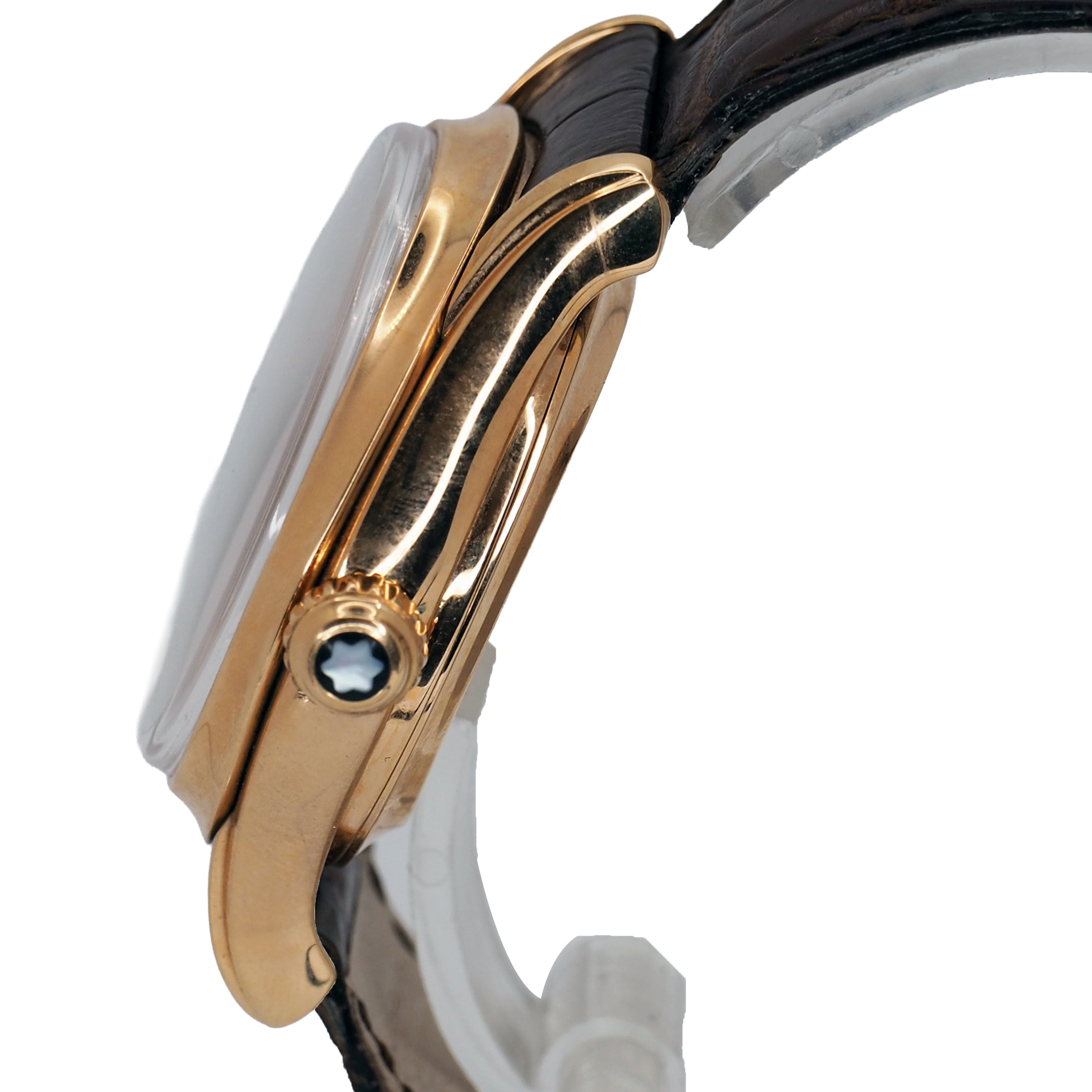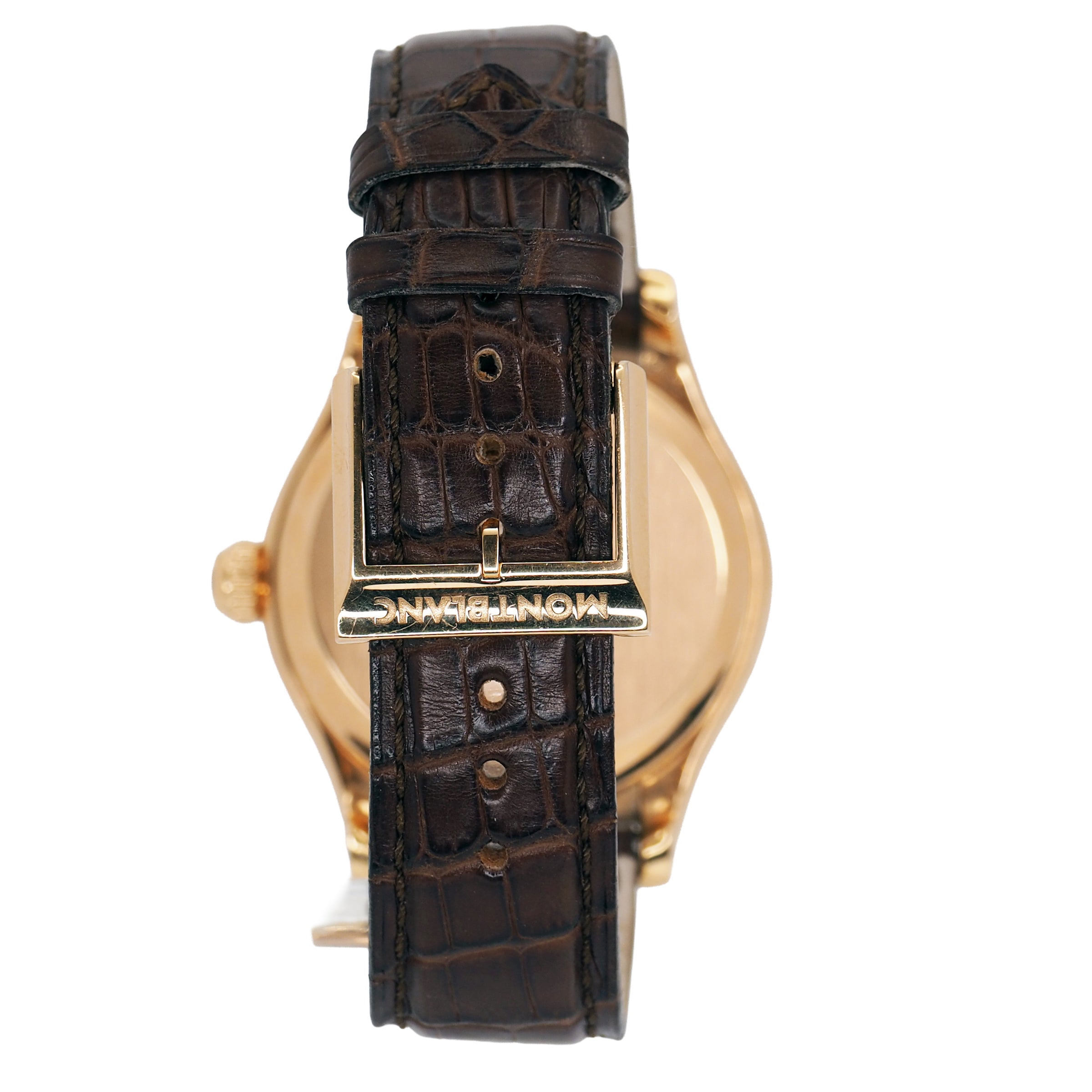 The Montblanc Villeret Ref. 103837 is a masterclass in traditional watchmaking, combining classical design with exquisite craftsmanship. Encased in polished 18k rose gold, its 41mm case makes a confident yet refined statement on the wrist. The warm tone of the gold pairs beautifully with a silver dial, creating a timeless aesthetic that speaks to elegance and sophistication. A sapphire crystal protects the dial, ensuring clarity and resistance to scratches, while the manual winding movement inside reinforces the connection between wearer and watch — a nod to the artistry of mechanical horology. This timepiece is fitted with a luxurious brown crocodile leather strap, secured by a traditional buckle, offering both comfort and style. With a water resistance of 3 ATM, it is well-suited to everyday elegance though not designed for immersion. This particular example comes in very good pre-owned condition, showing only minimal signs of wear, and includes the original box and papers, enhancing its collectibility and provenance. The Montblanc Villeret is the ideal choice for a discerning collector or enthusiast who values timeless design, fine mechanics, and the enduring appeal of Swiss tradition.