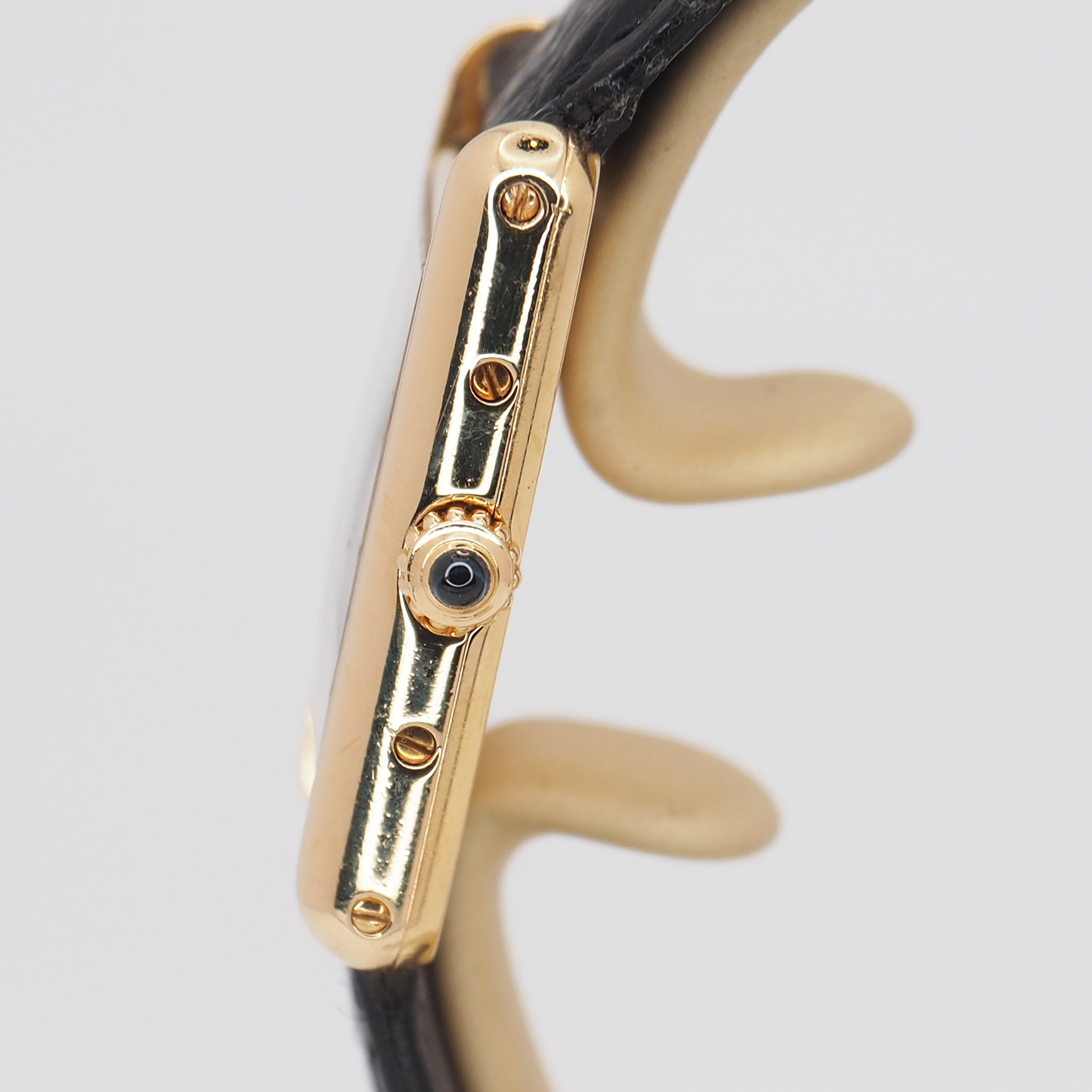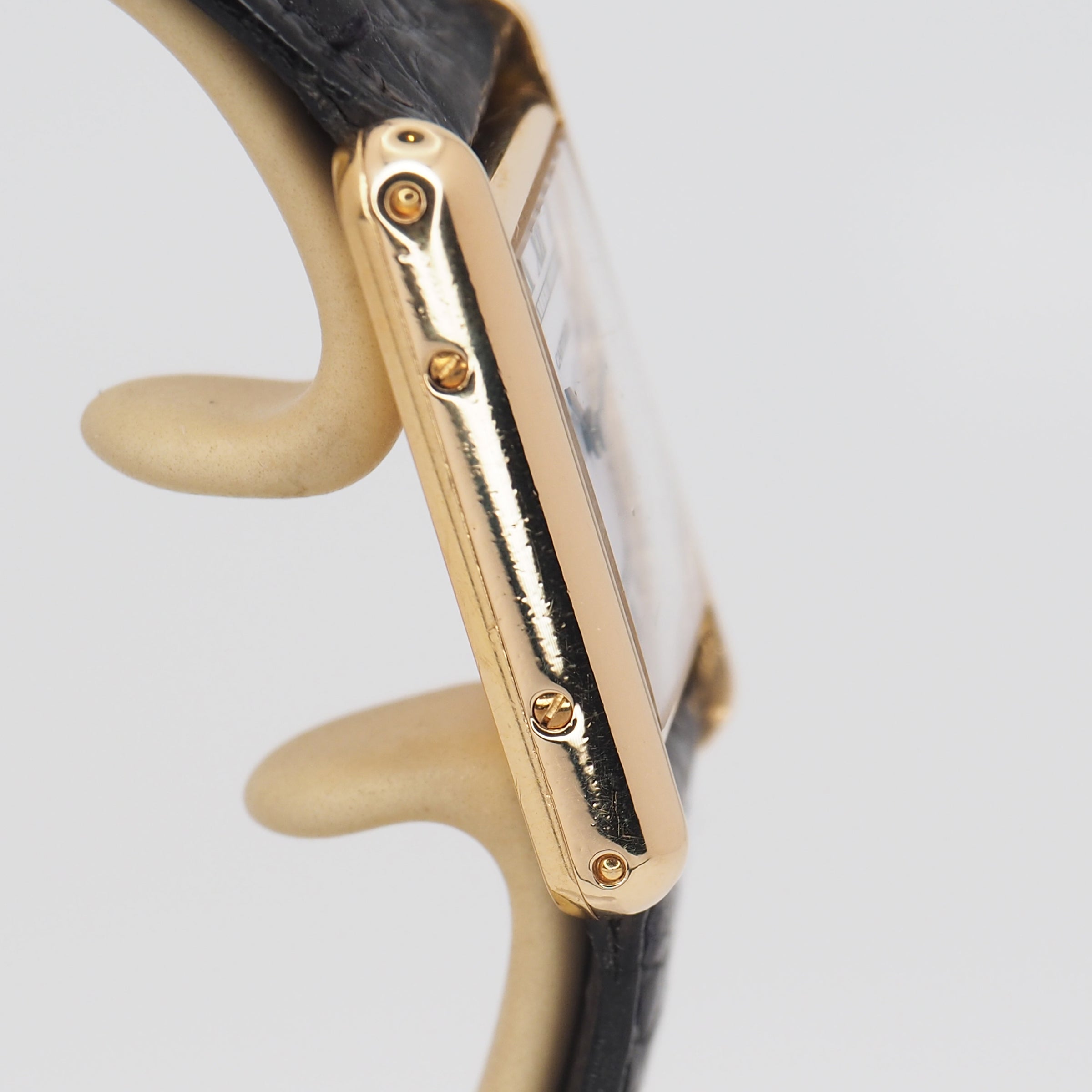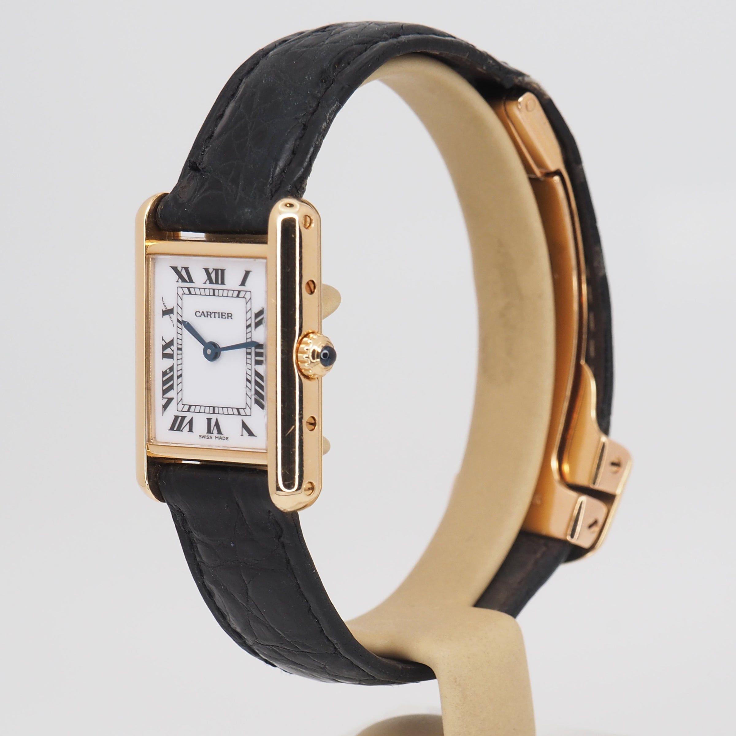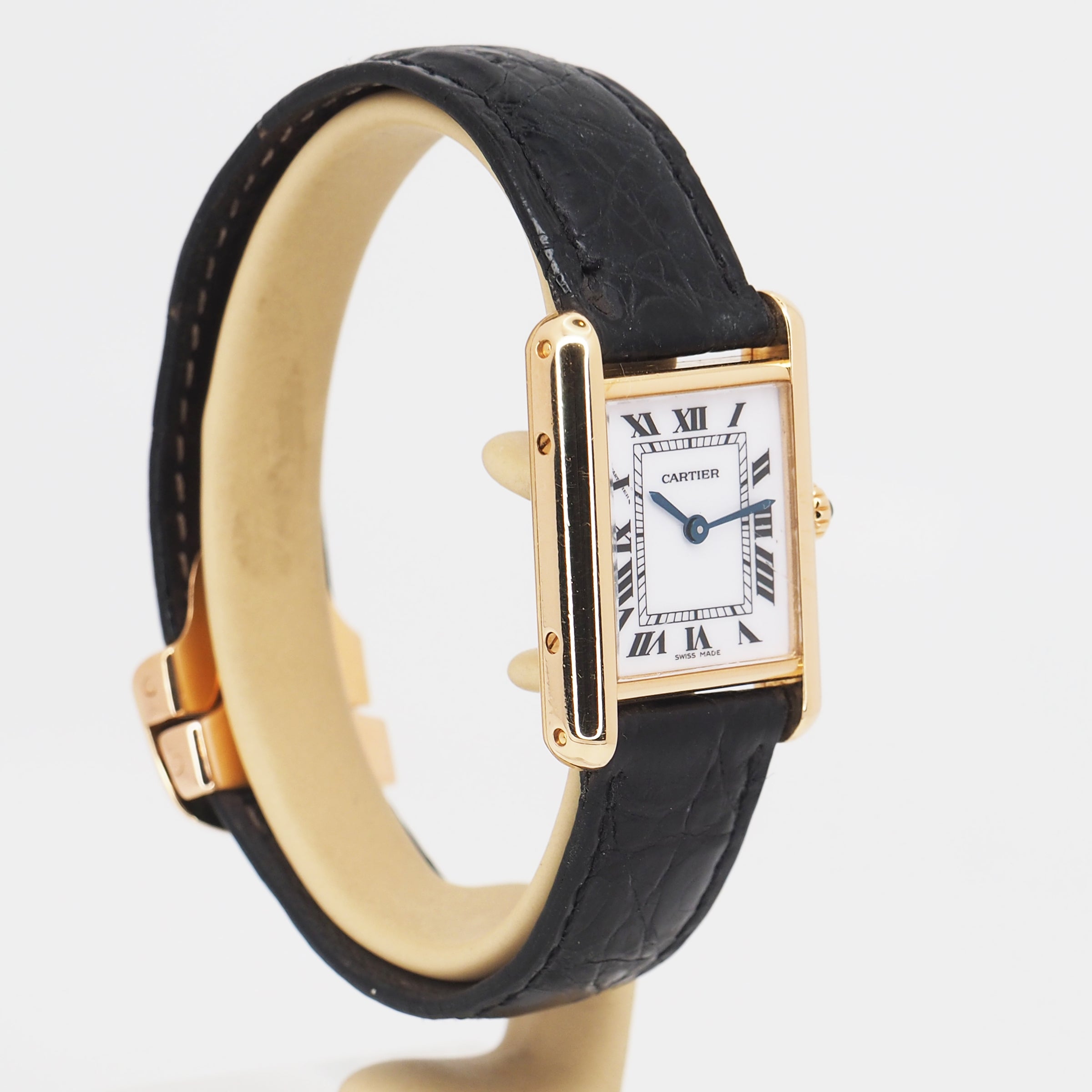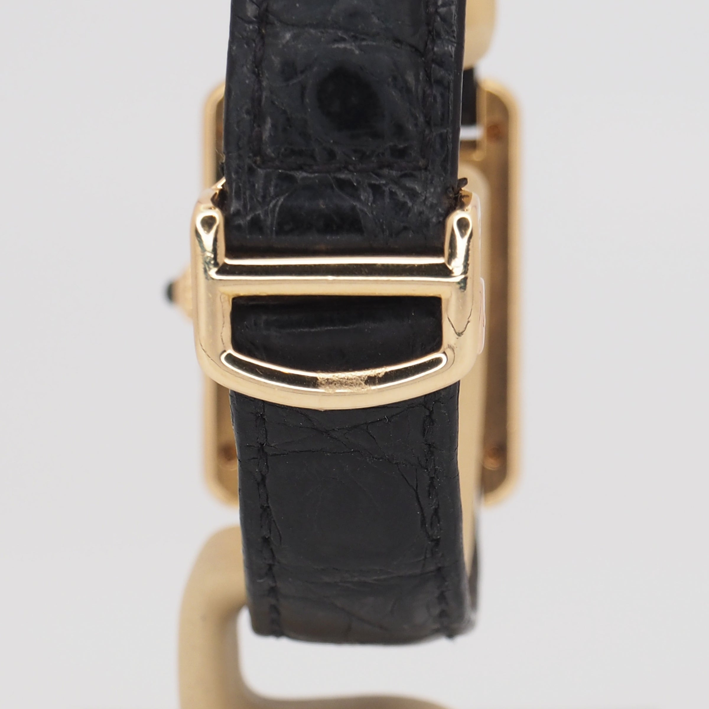 The Cartier Tank 1150 is a timeless embodiment of elegance and sophistication, showcasing the brand’s iconic design language in a sleek and understated format. Crafted in a classic yellow gold-plated case, this model exudes vintage charm while maintaining the clean, geometric lines that have made the Tank an enduring symbol of refined taste since its debut in 1917. The rectangular case houses a crisp white dial adorned with Cartier’s signature Roman numeral hour markers and blued steel hands, offering a subtle contrast that enhances legibility and style. A precise quartz movement ensures reliable timekeeping with minimal maintenance, making it a perfect companion for both daily wear and formal occasions. Paired with a leather strap, the Cartier Tank 1150 remains a distinguished choice for those who appreciate timeless design and discreet luxury. A must-have for collectors and enthusiasts alike, this piece represents Cartier’s legacy of craftsmanship and elegance in its purest form.