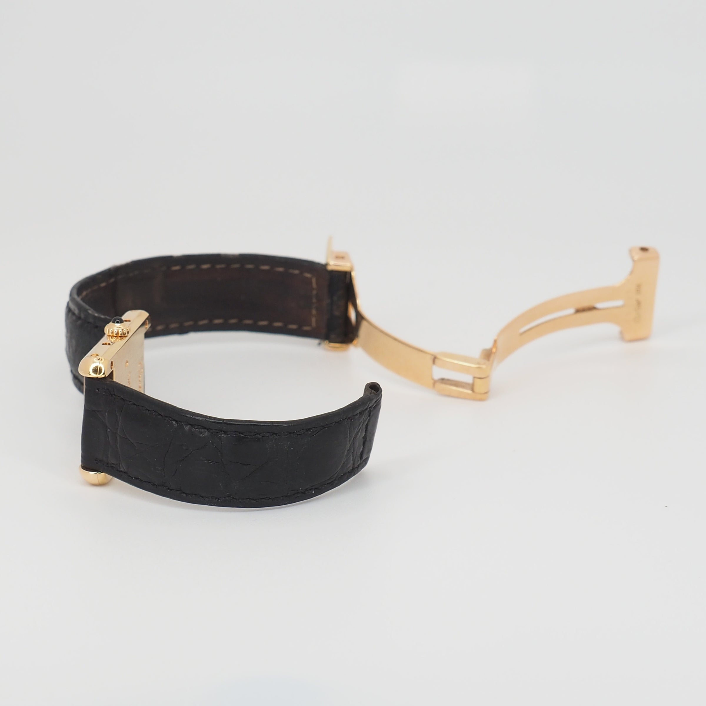 Bracelet: Black alligator strap with yellow gold folding clasp.