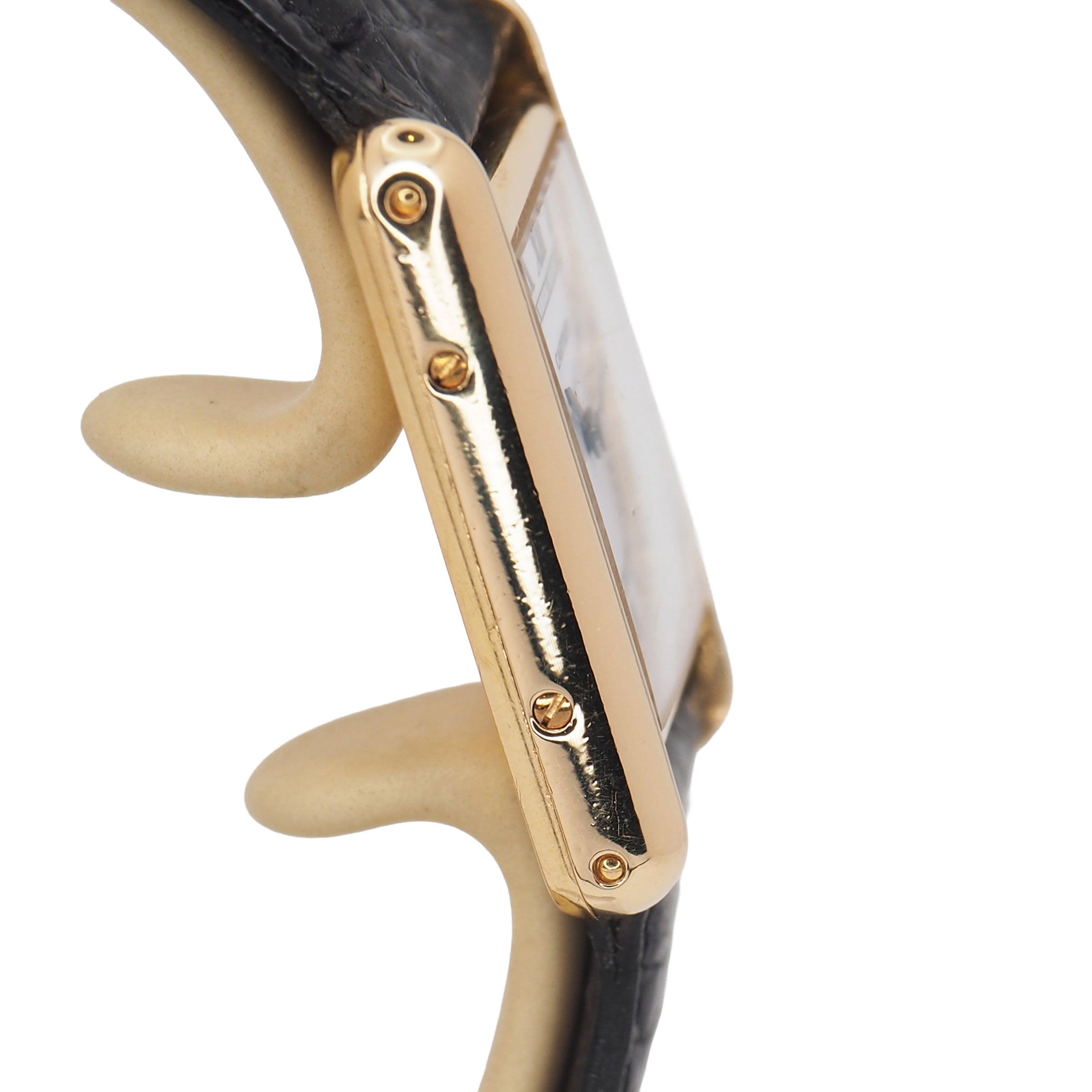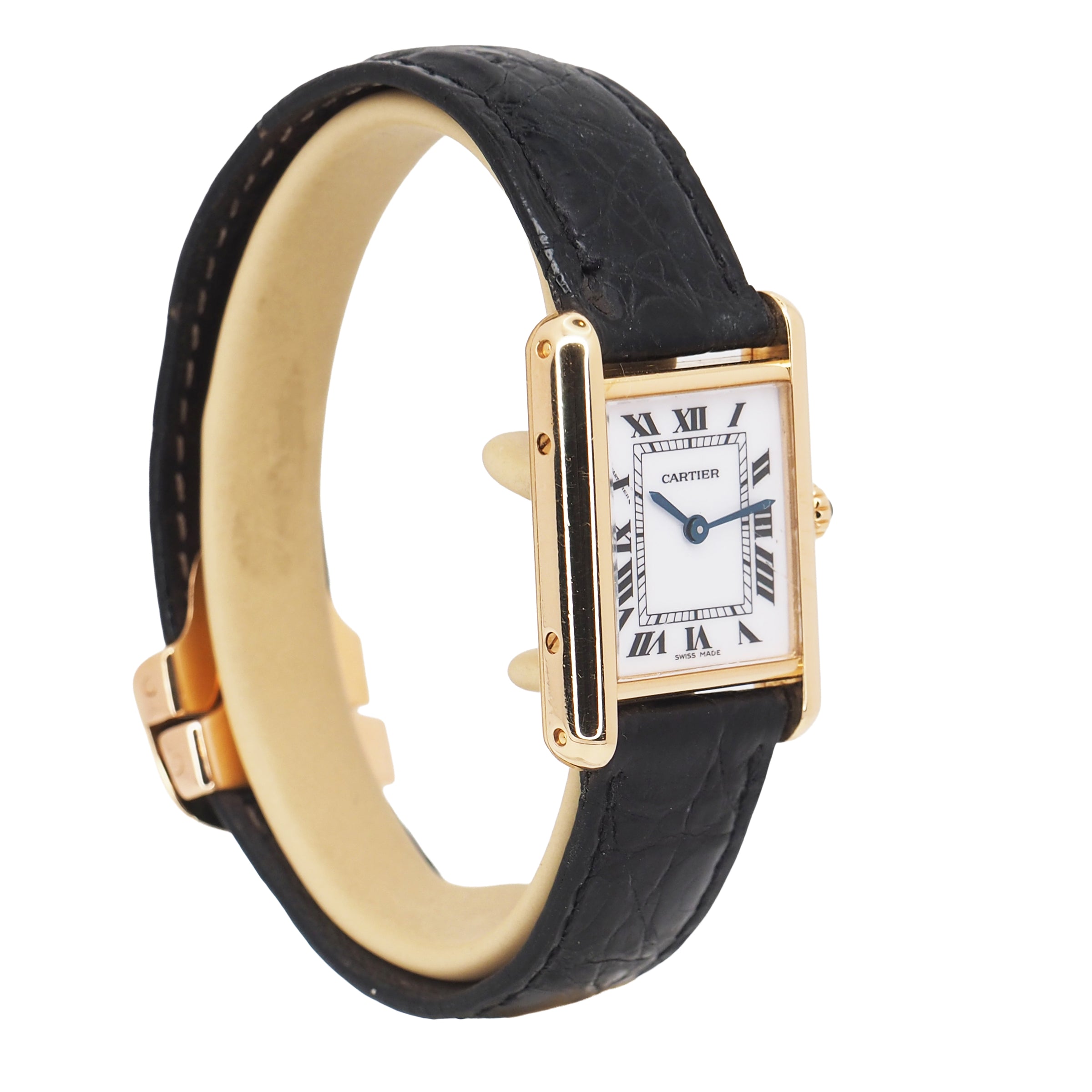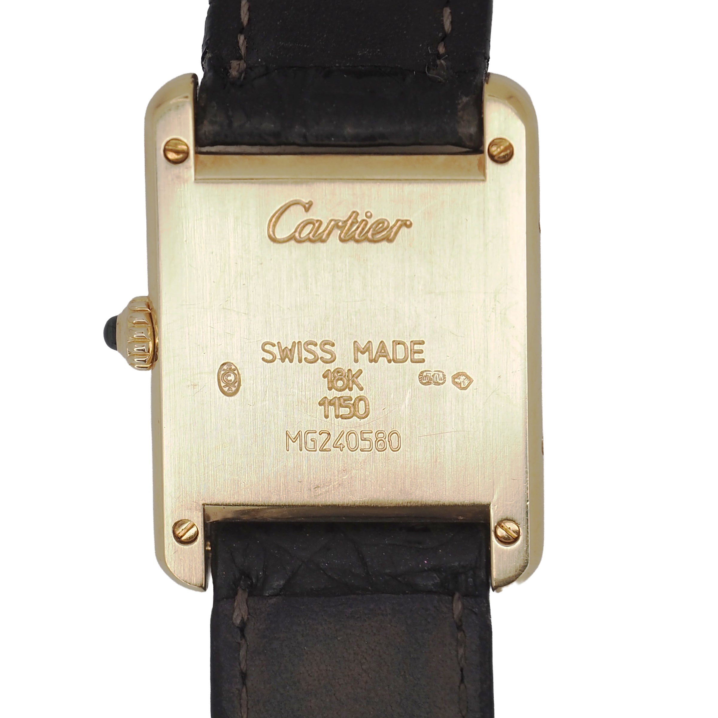 The Cartier Tank 1150 is a timeless embodiment of elegance and sophistication, showcasing the brand’s iconic design language in a sleek and understated format. Crafted in a classic yellow gold-plated case, this model exudes vintage charm while maintaining the clean, geometric lines that have made the Tank an enduring symbol of refined taste since its debut in 1917. The rectangular case houses a crisp white dial adorned with Cartier’s signature Roman numeral hour markers and blued steel hands, offering a subtle contrast that enhances legibility and style. A precise quartz movement ensures reliable timekeeping with minimal maintenance, making it a perfect companion for both daily wear and formal occasions. Paired with a leather strap, the Cartier Tank 1150 remains a distinguished choice for those who appreciate timeless design and discreet luxury. A must-have for collectors and enthusiasts alike, this piece represents Cartier’s legacy of craftsmanship and elegance in its purest form.