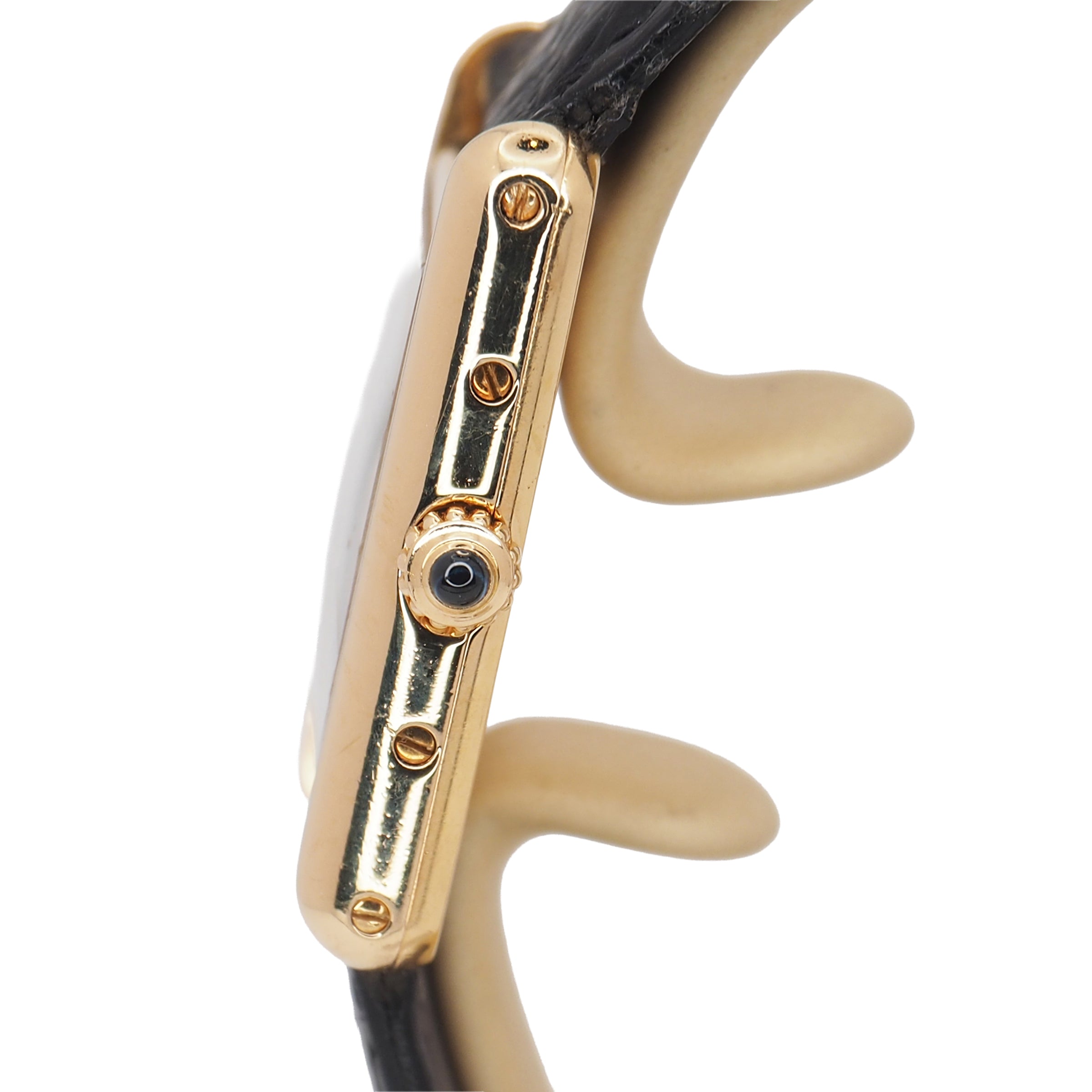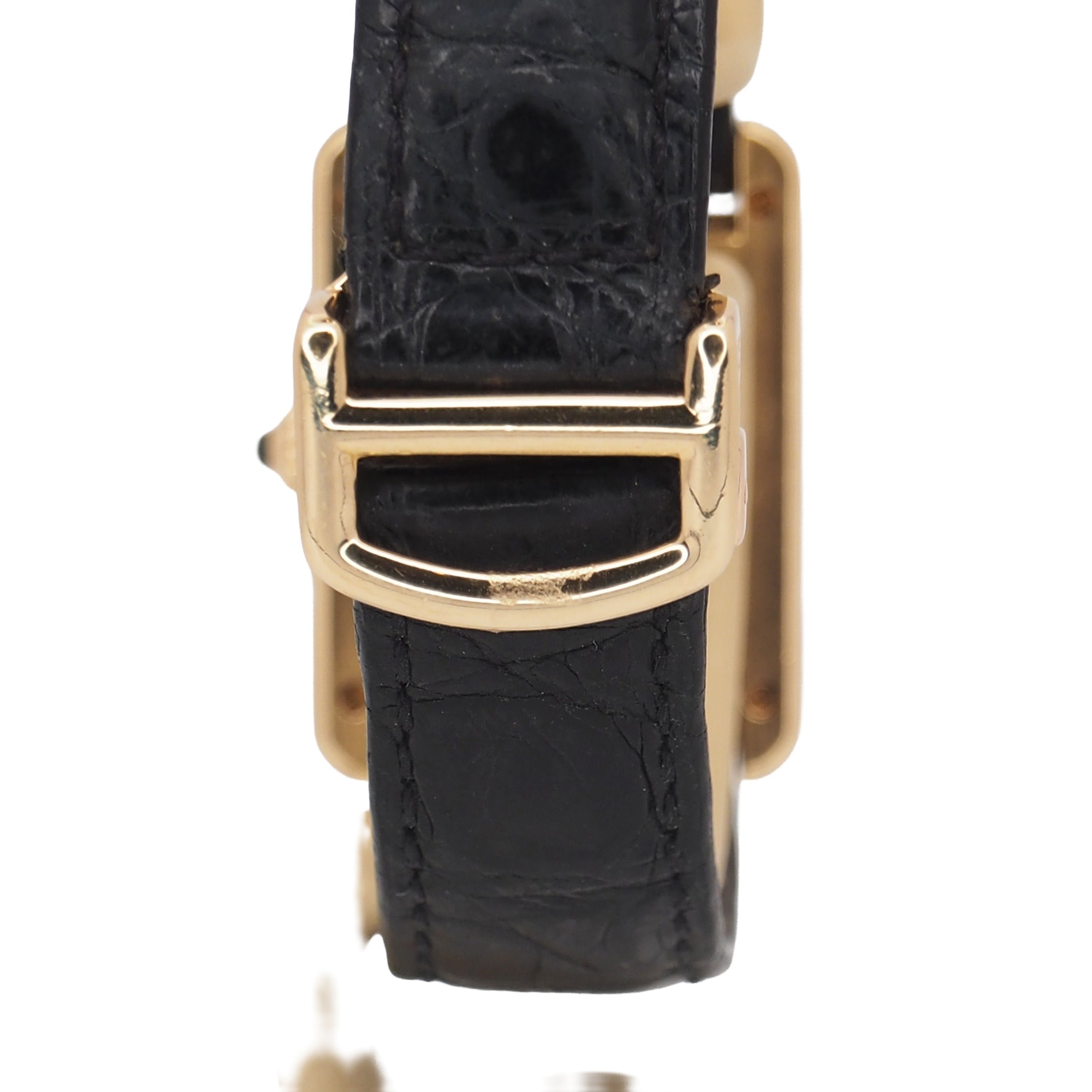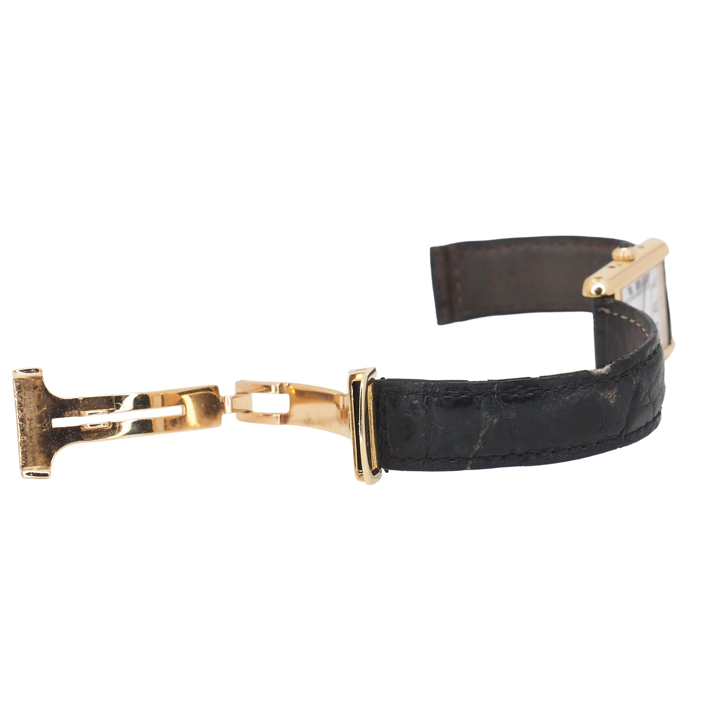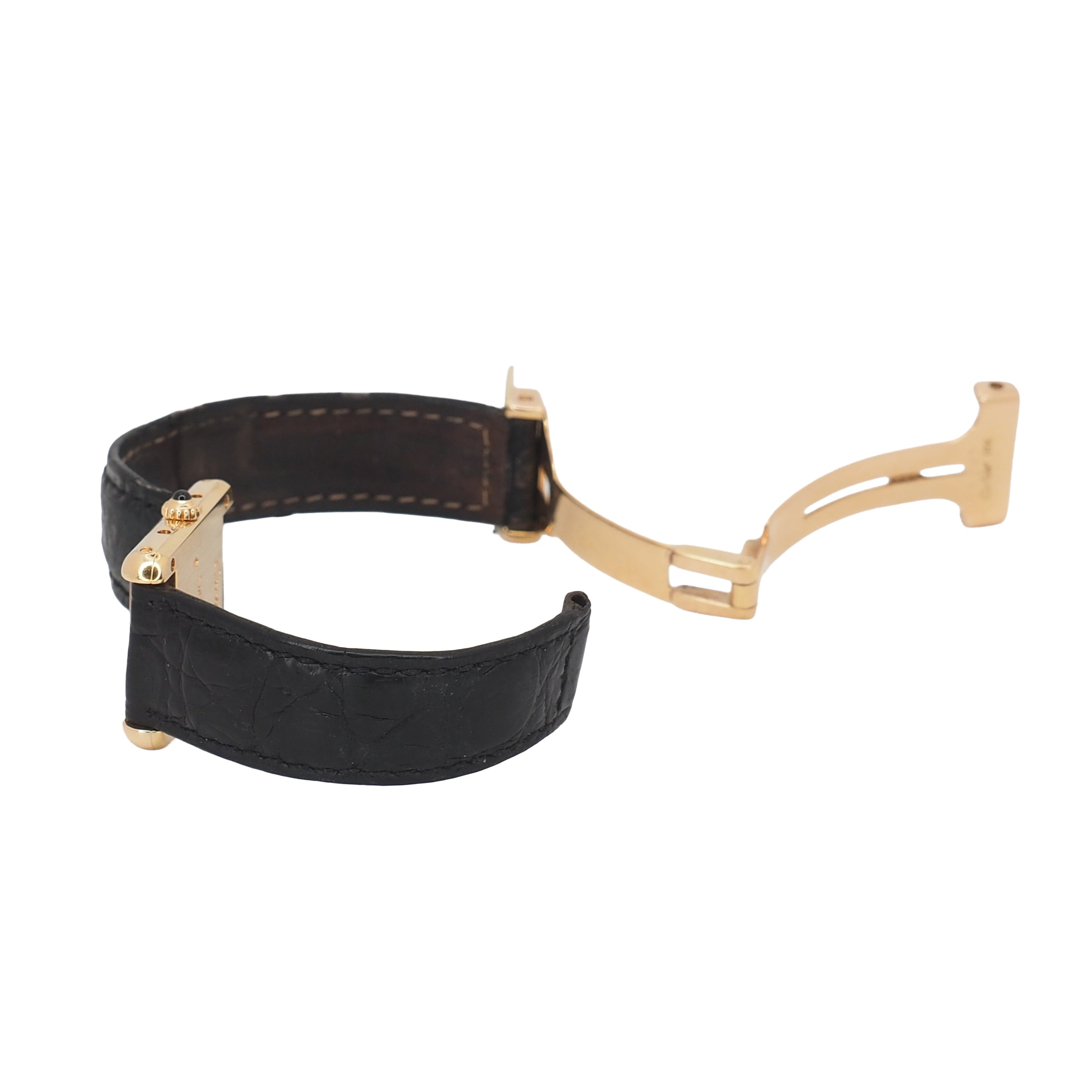 Bracelet: Black alligator strap with yellow gold folding clasp.